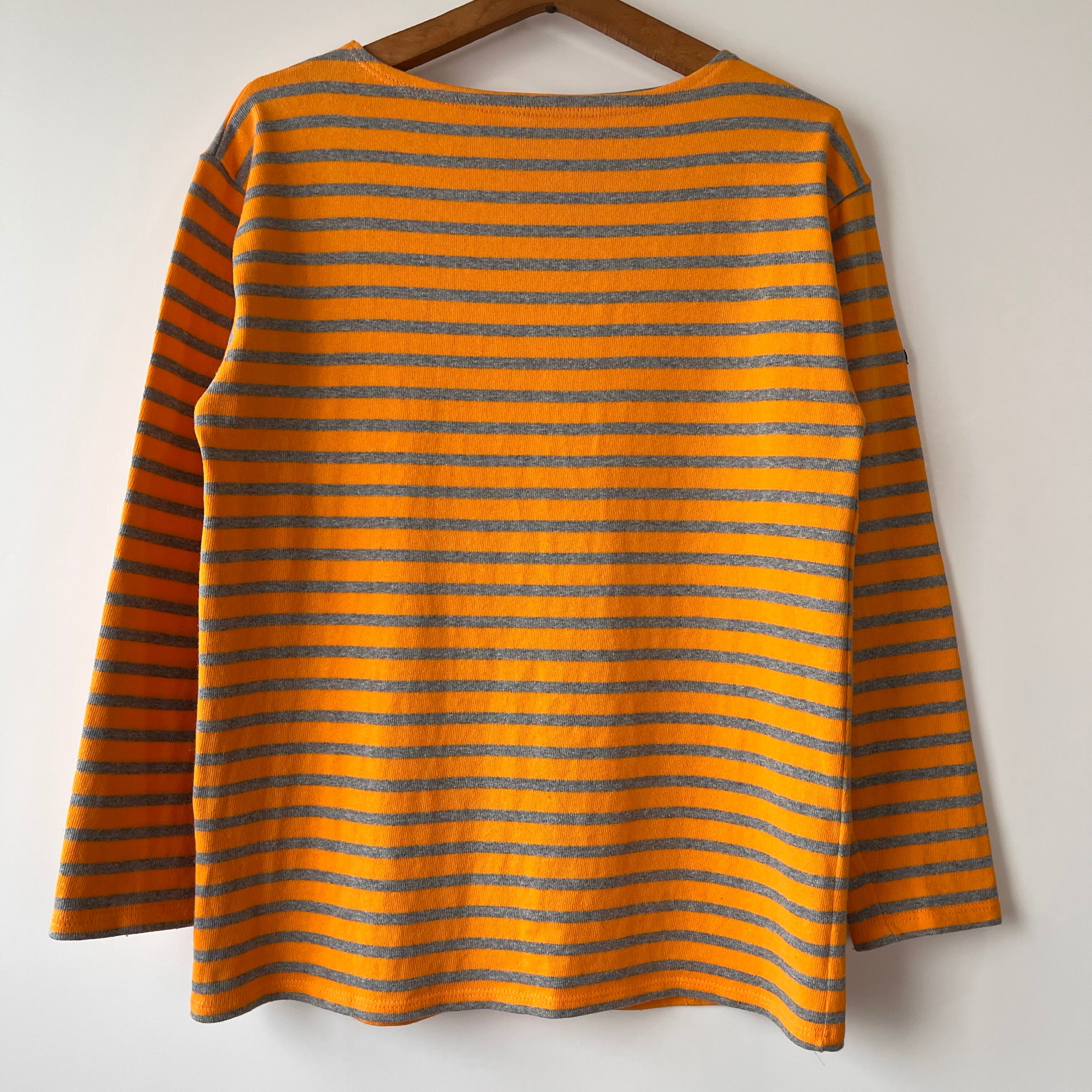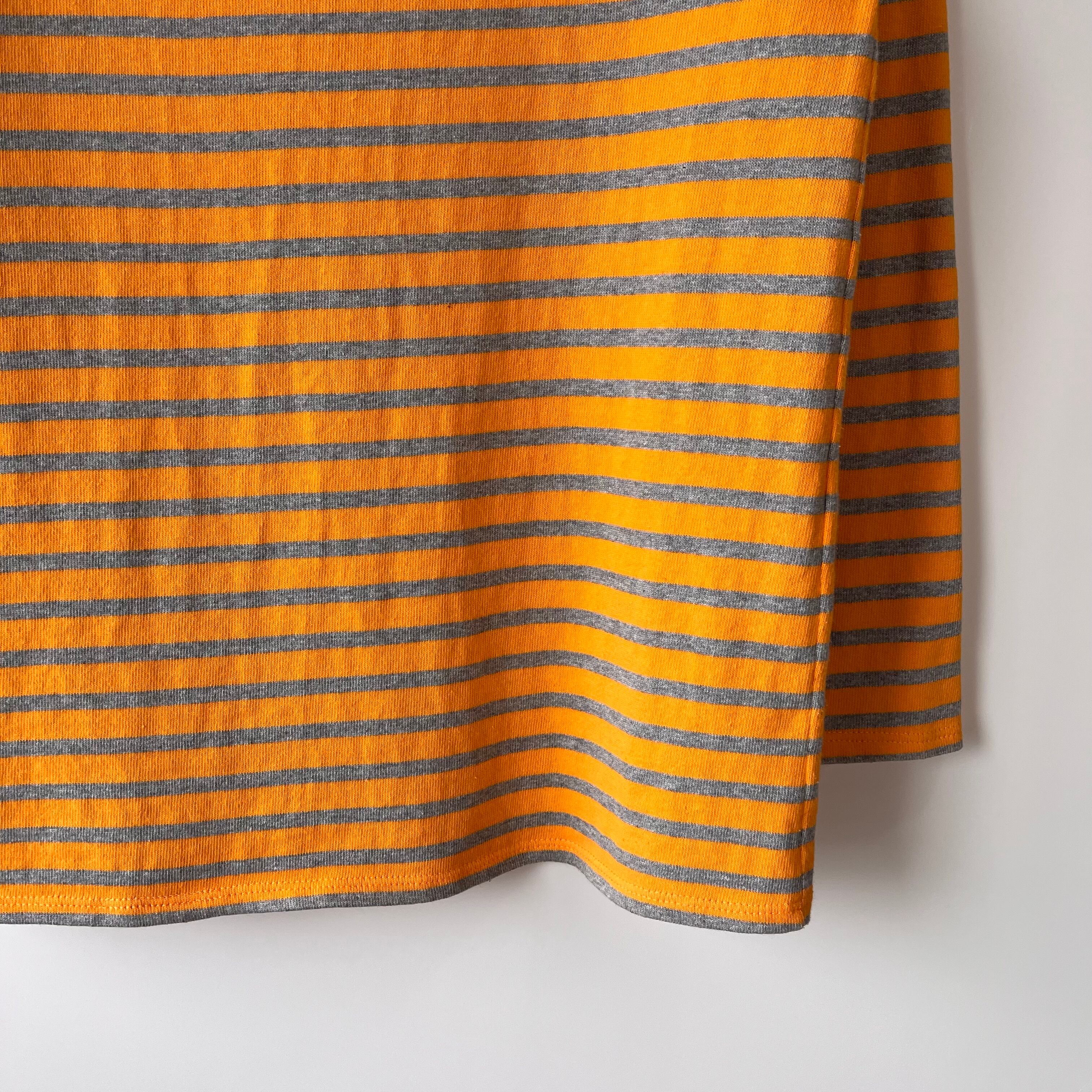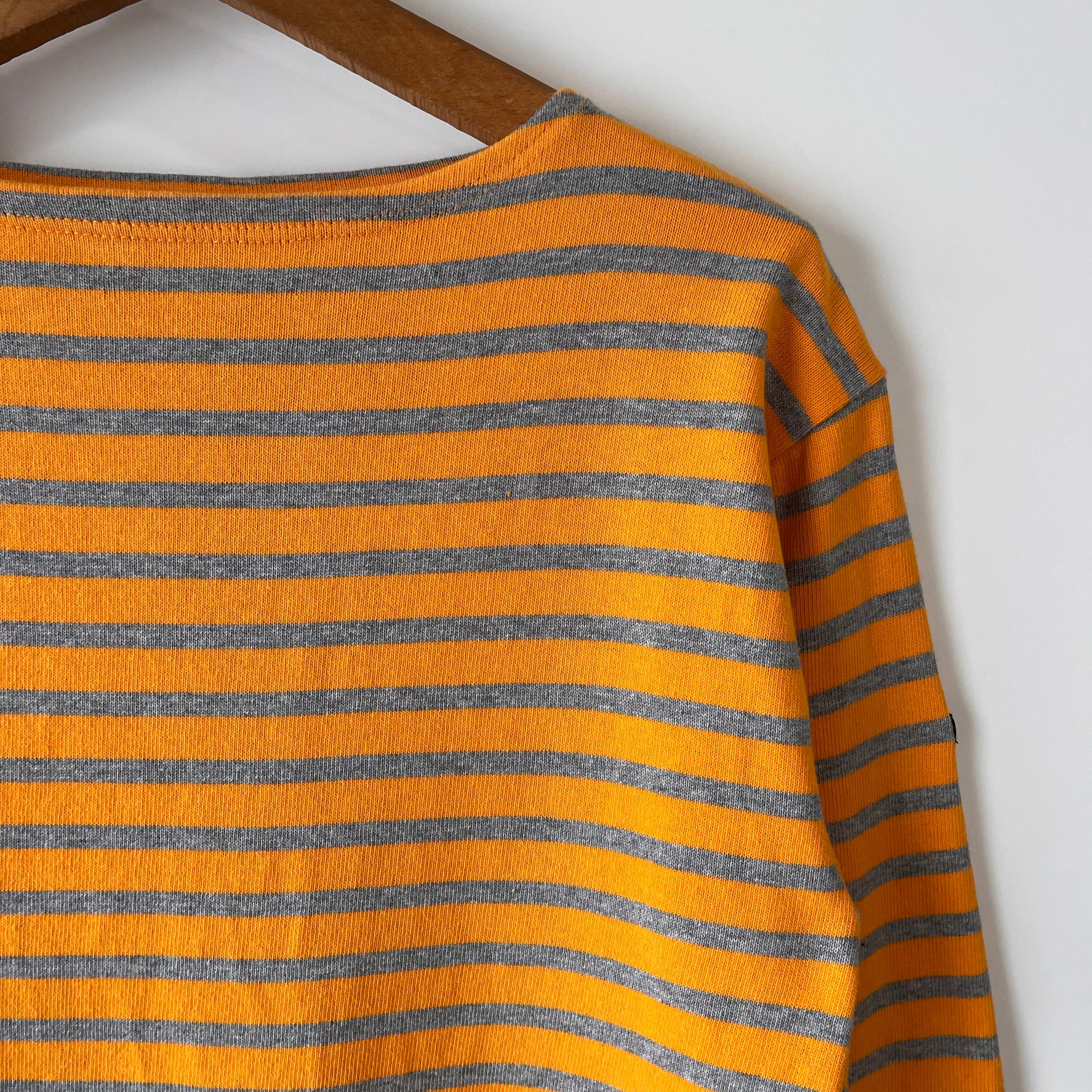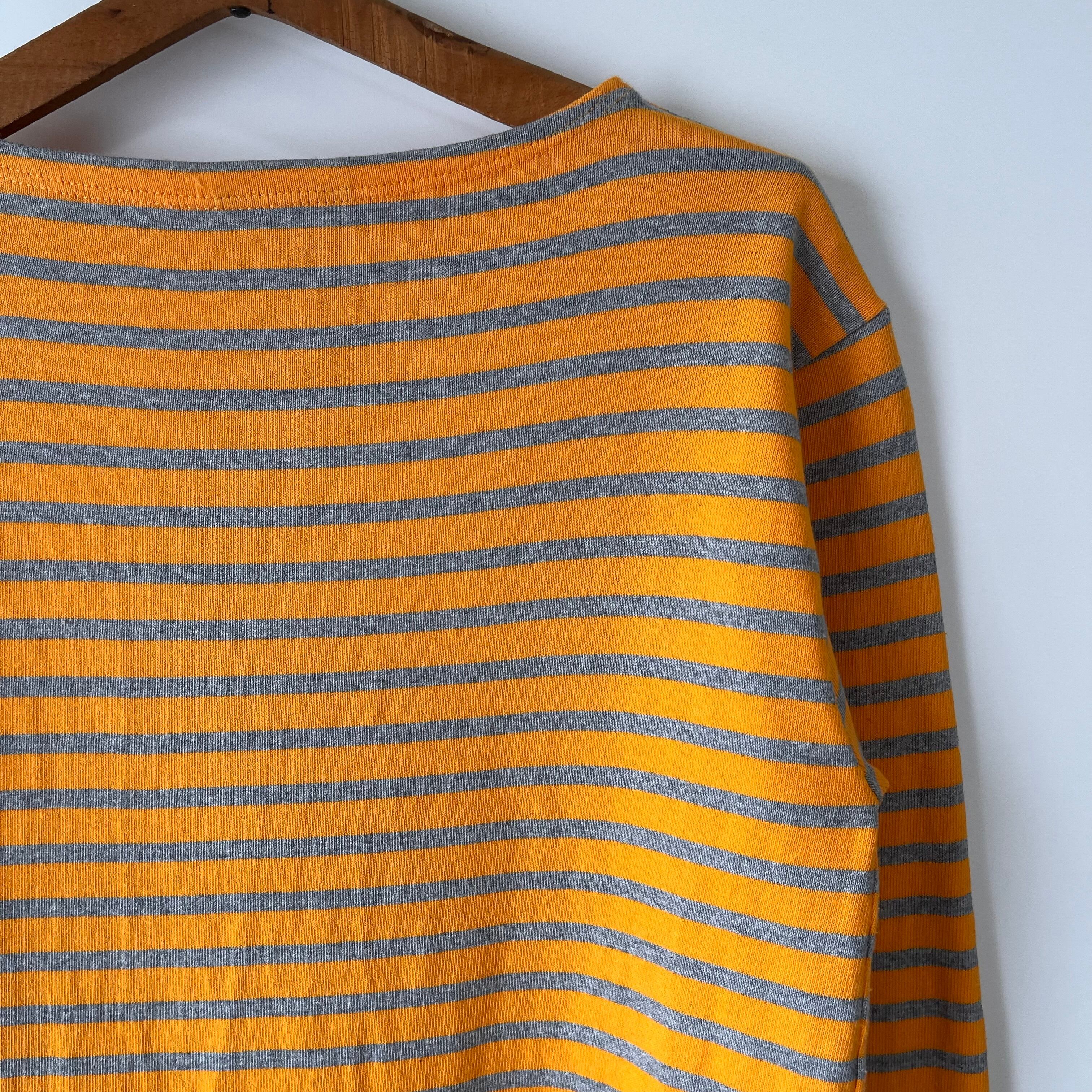フランス発祥の老舗ブランドSAINT JAMESの代表的な商品です。オレンジとグレーの鮮やかなボーダー柄が特徴で、洗練されたデザインが魅力的です。フランス北部の沿岸地域で誕生したブランドらしいマリンルックを楽しむことができ、旧タグが付く個体です。