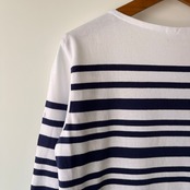 フランス発祥の老舗ブランド、ORCIVALの代表的なアイテムです。ホワイトとネイビーのクラシカルなボーダー柄が特徴で、シンプルながらも洗練されたデザインが魅力的です。フランス北部の沿岸地域で誕生したブランドらしいマリンルックを楽しむことができる一枚です。