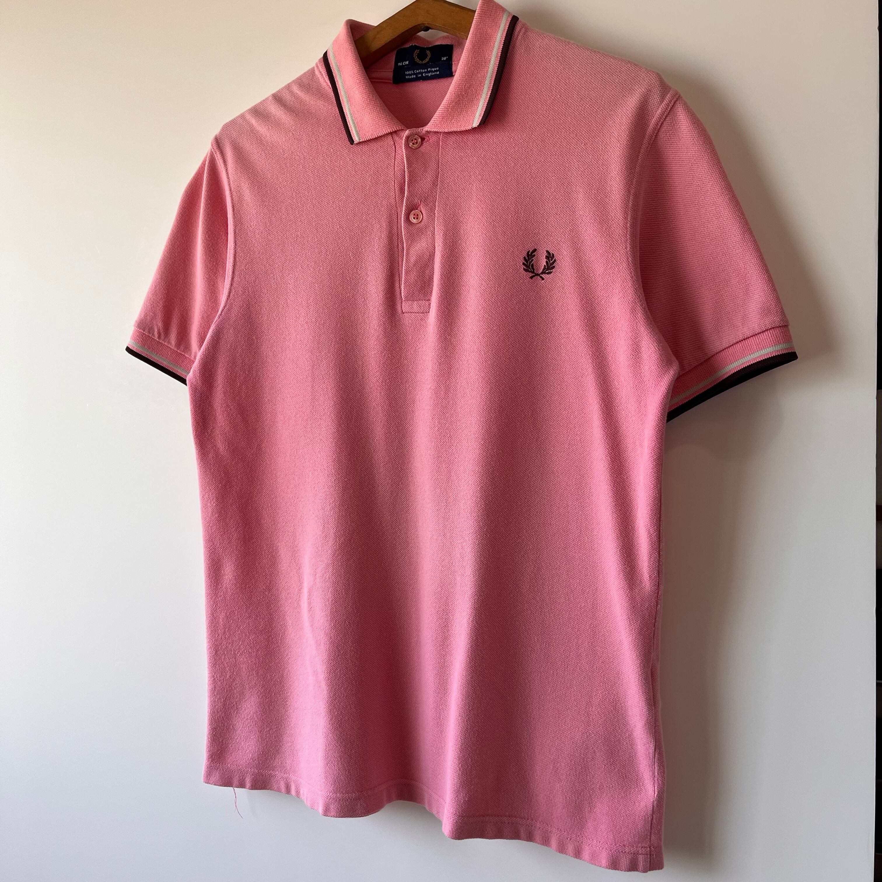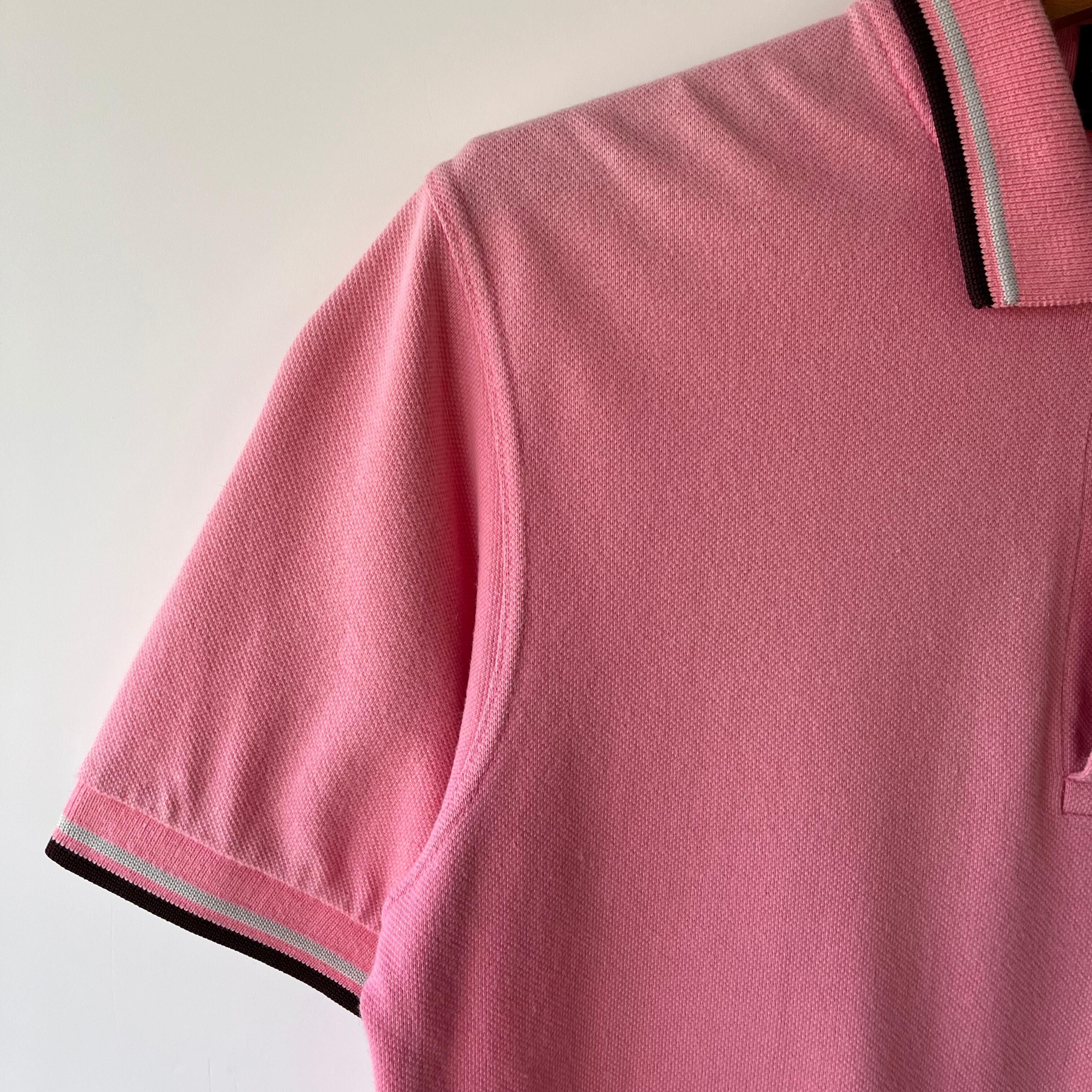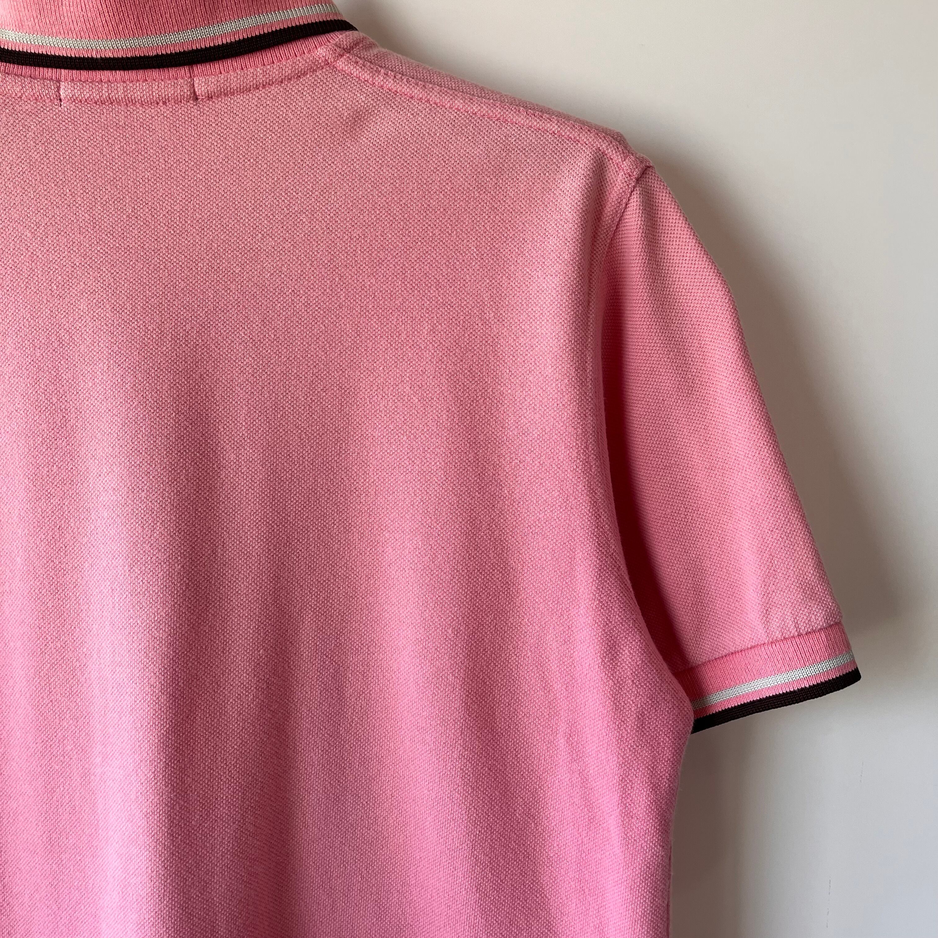 ピンクのボディに、襟と袖に入るラインがバーガンディとホワイトのパターンで、華やかでありながらもスポーティーな印象です。ボタンにブランド名が入り、胸元にローレルリーフの刺繍が良いアクセントになっています。