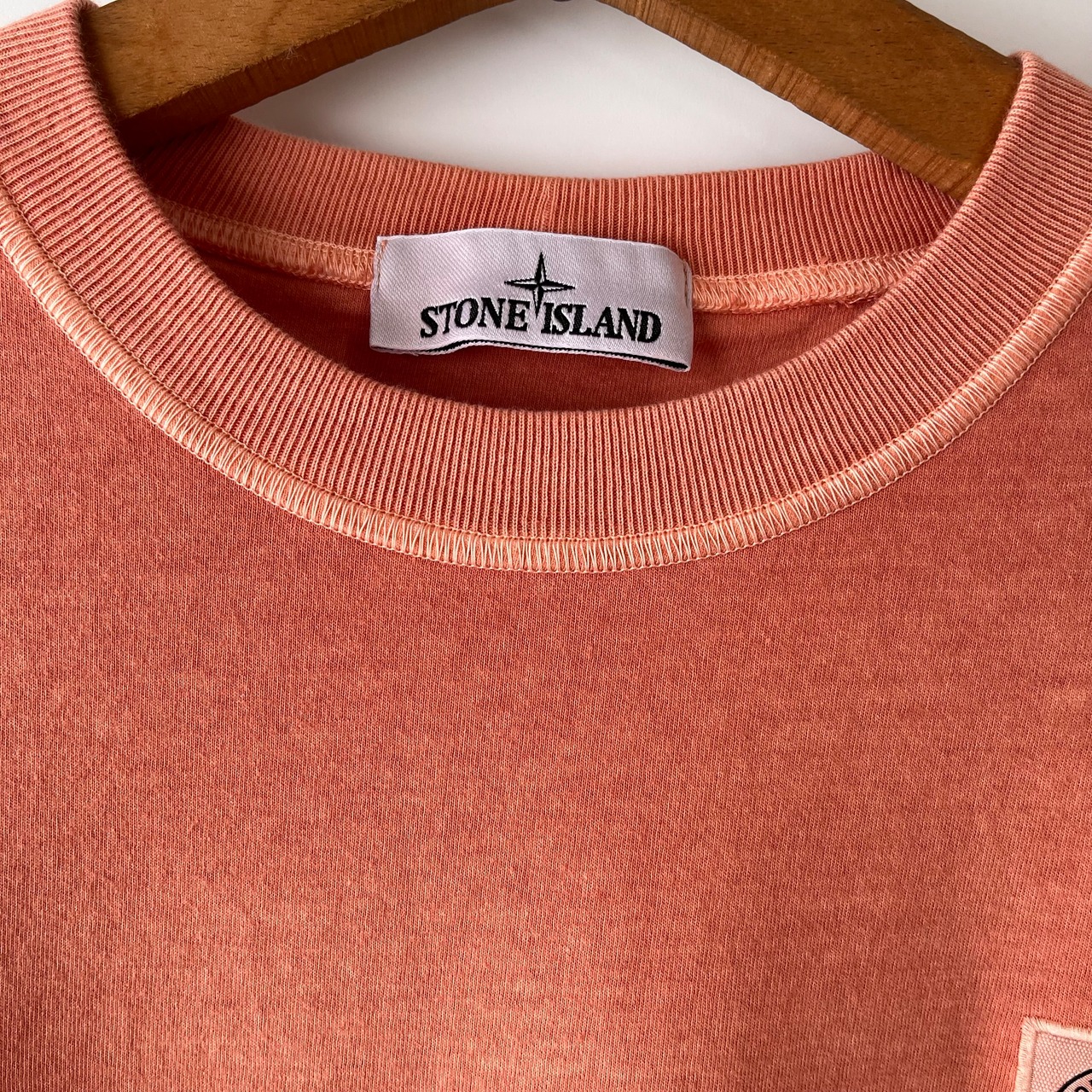 ストーンアイランドの左胸にロゴがつく、シンプルなTシャツです。鮮やかなオレンジカラーが目を引き、スタイルに華やかさを添えます。