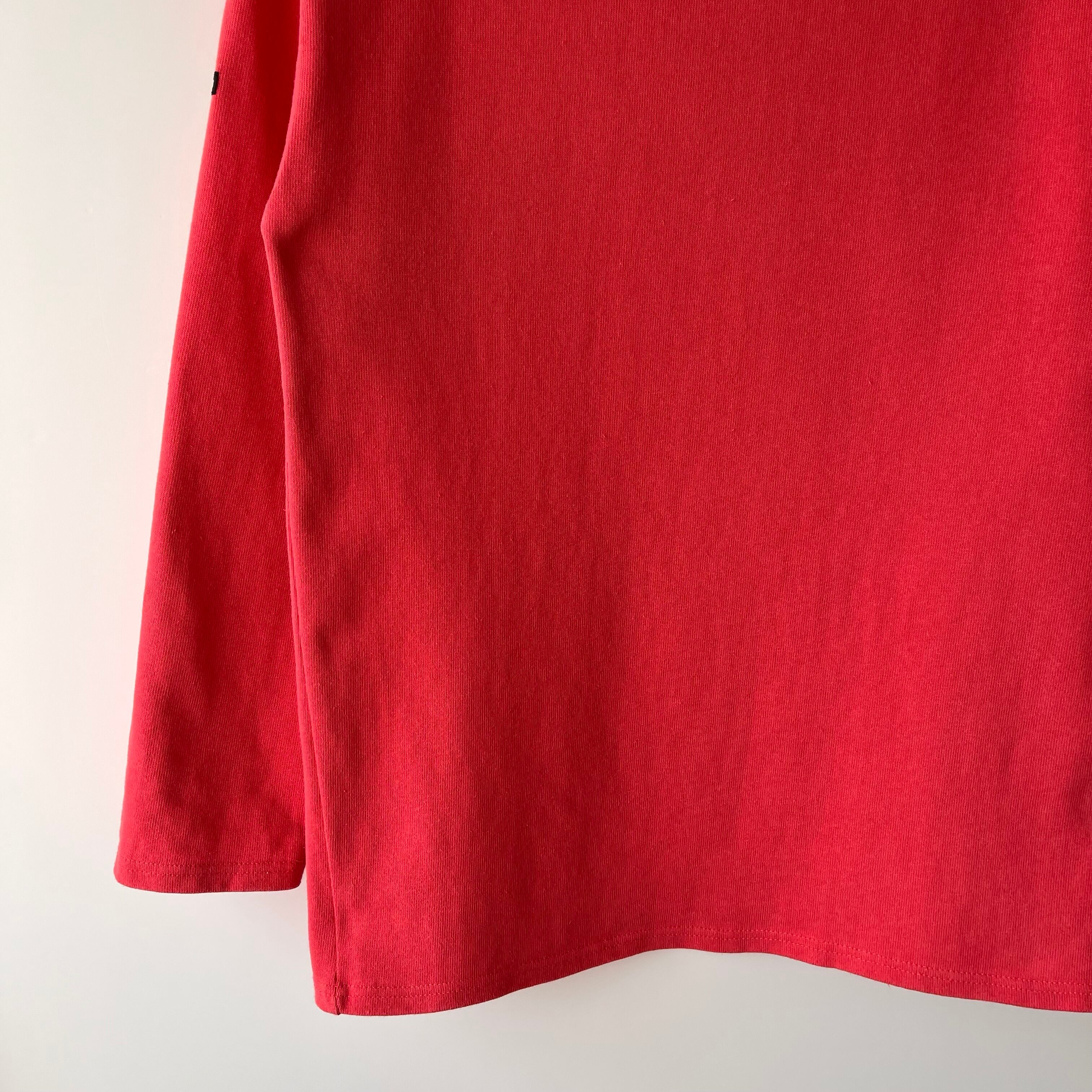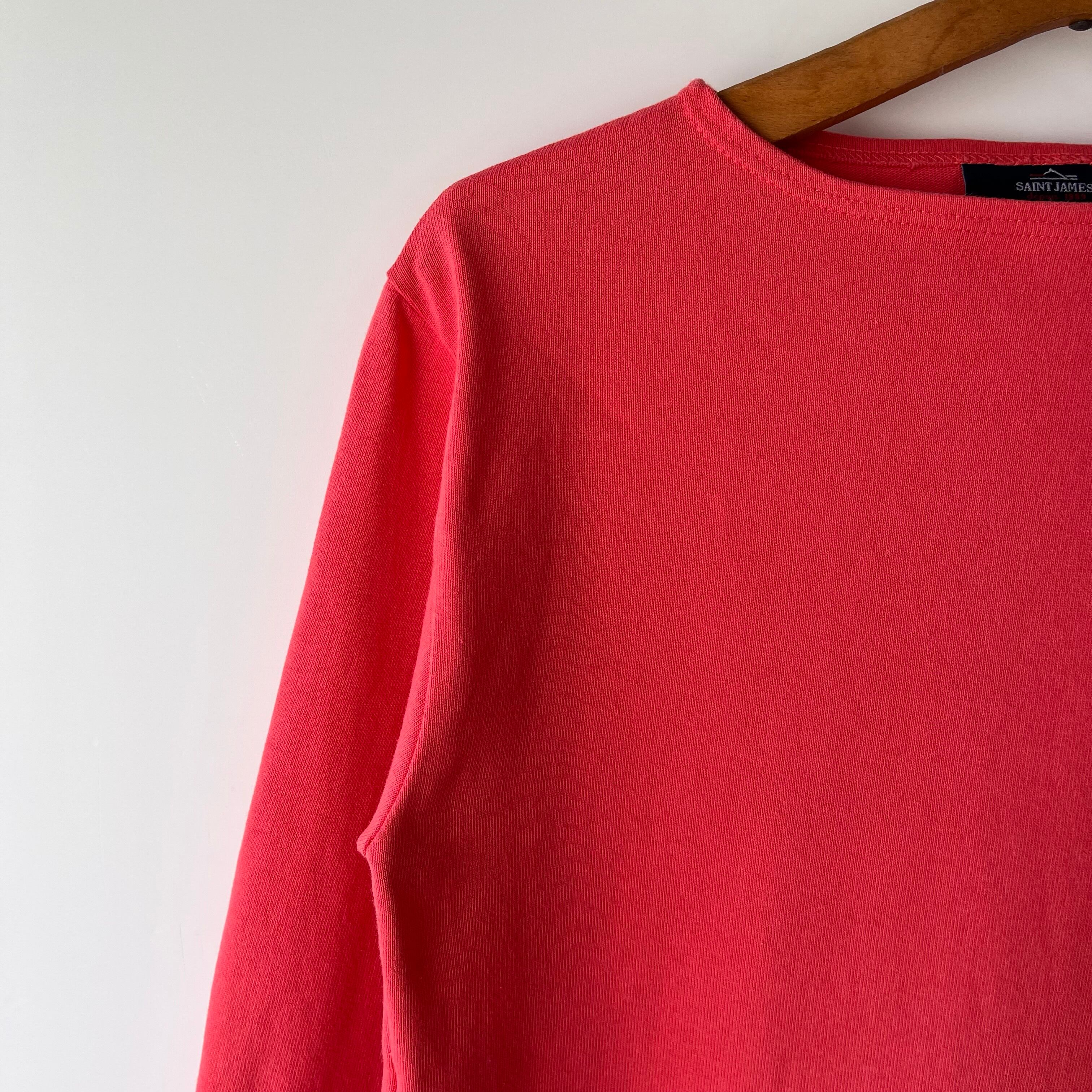 フランス発祥の老舗ブランドSAINT JAMESの代表的な商品です。無地の濃いピンクカラーが特徴で、シンプルながらも洗練されたデザインが魅力的です。フランス北部の沿岸地域で誕生したブランドらしいマリンルックを楽しむことができる一枚です。