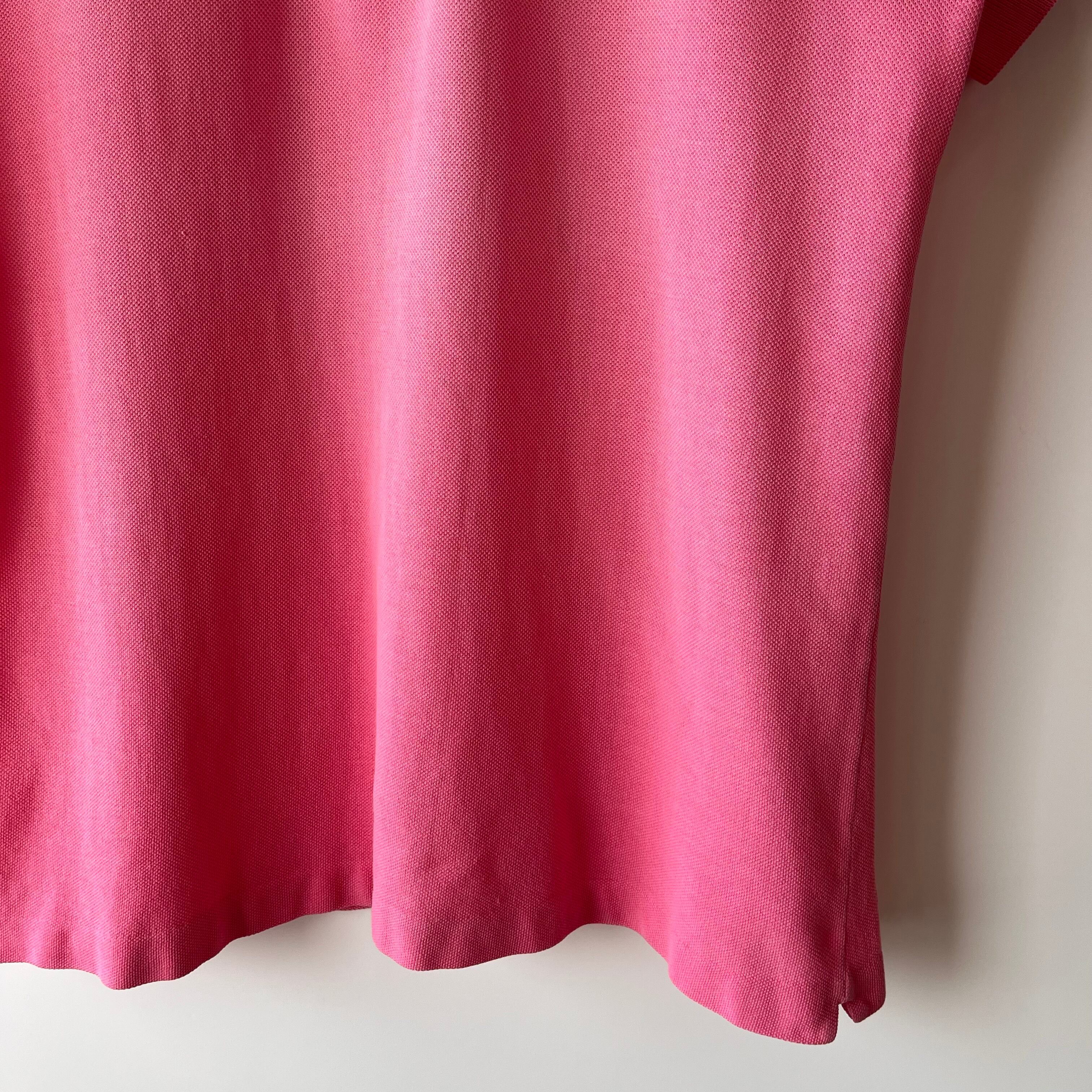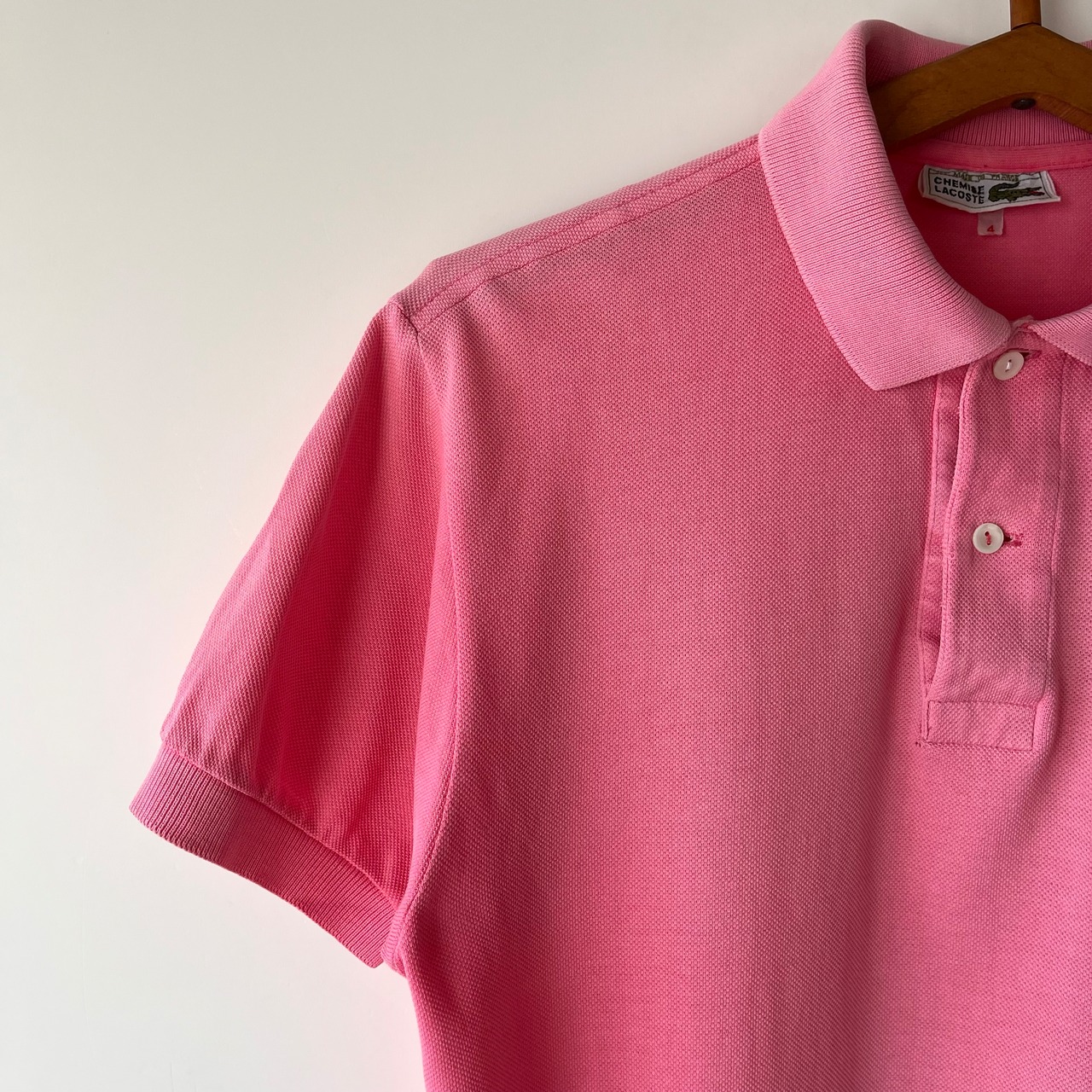 ラコステの半袖ポロシャツです。フランス製の高品質な一着で、シンプルながらも洗練されたデザインが魅力です。クラシックな襟と、身体にフィットするシルエットが、カジュアルシーンはもちろん、ちょっとしたお出かけにも最適です。胸元にはお馴染みのワニの刺繍が施されており、さりげないアクセントになっています。