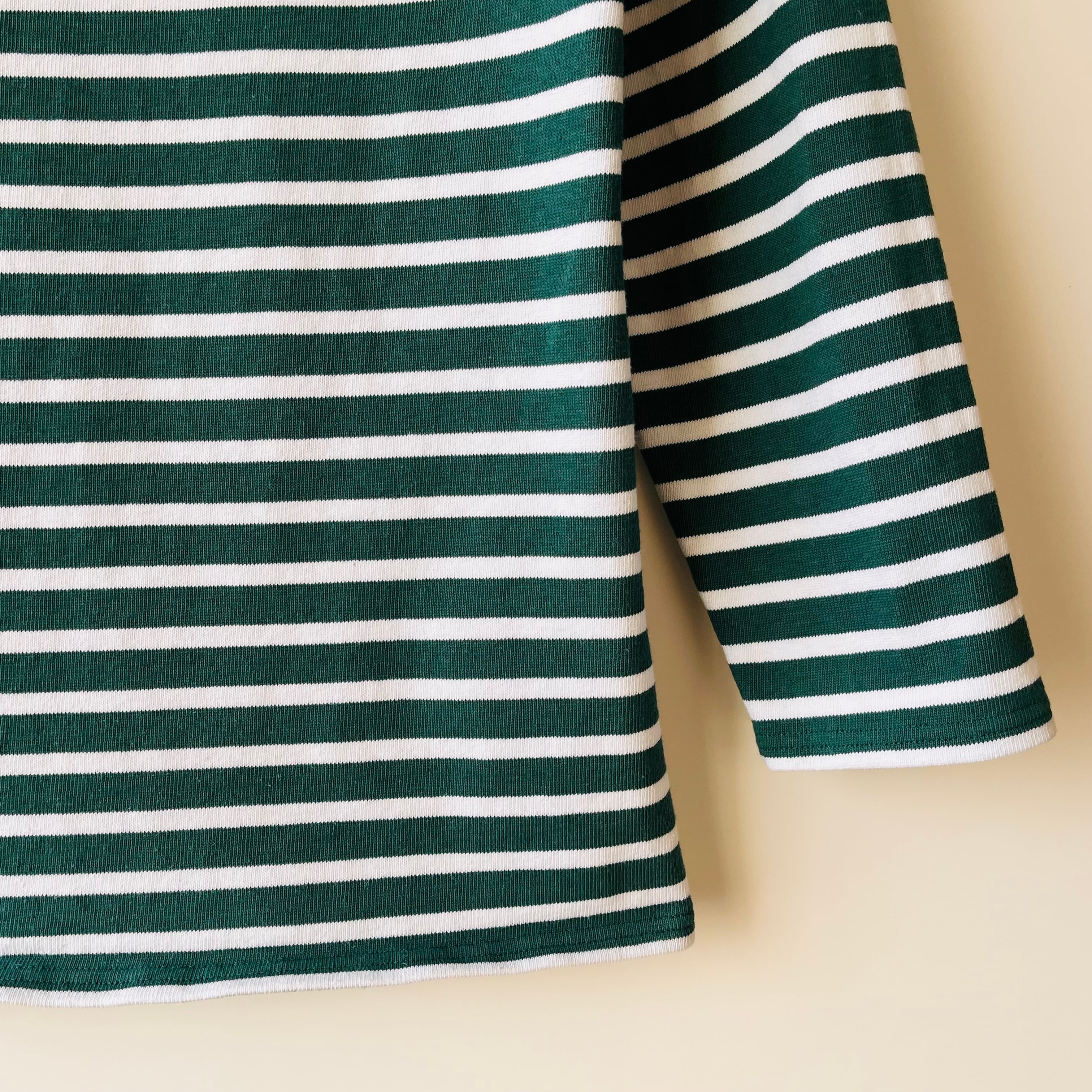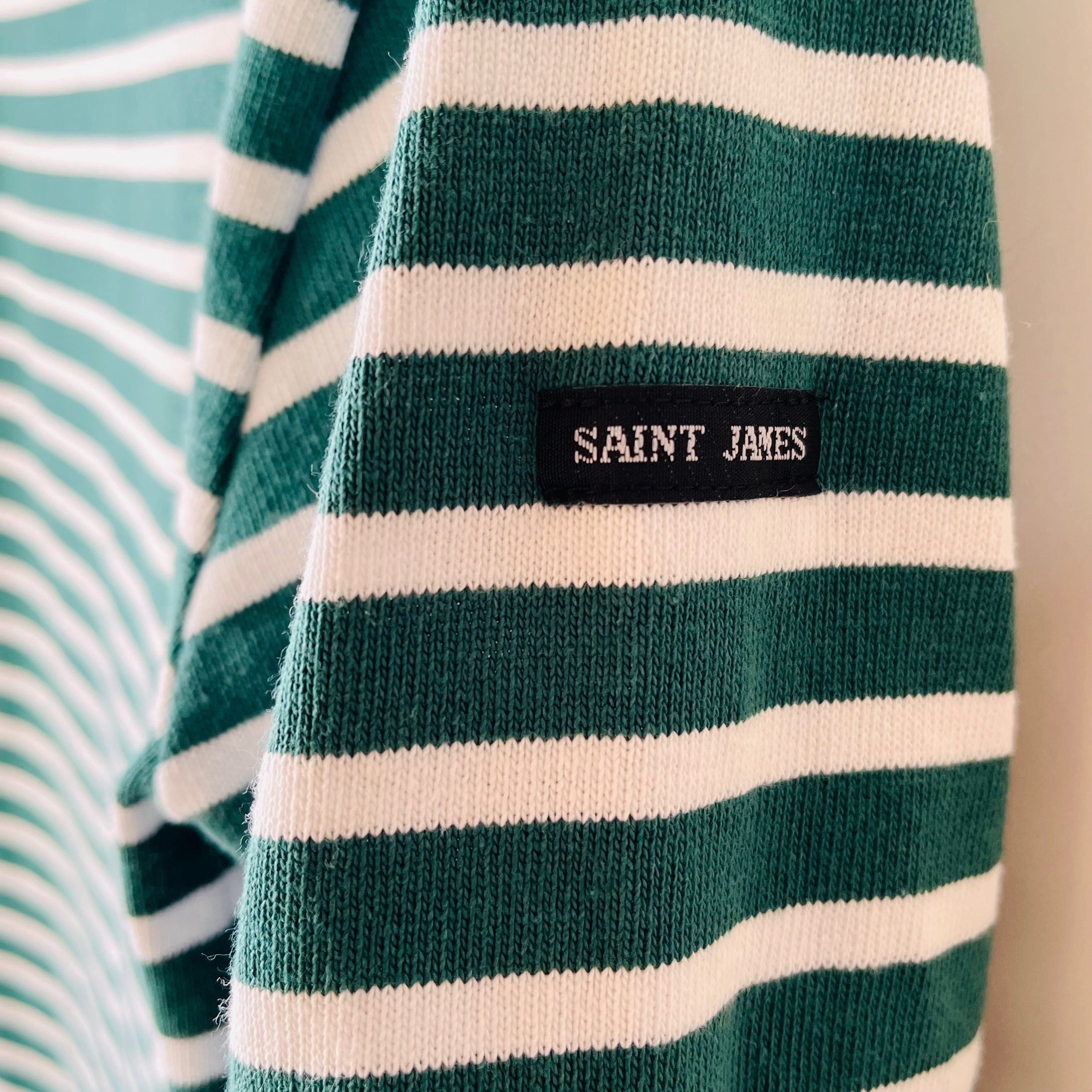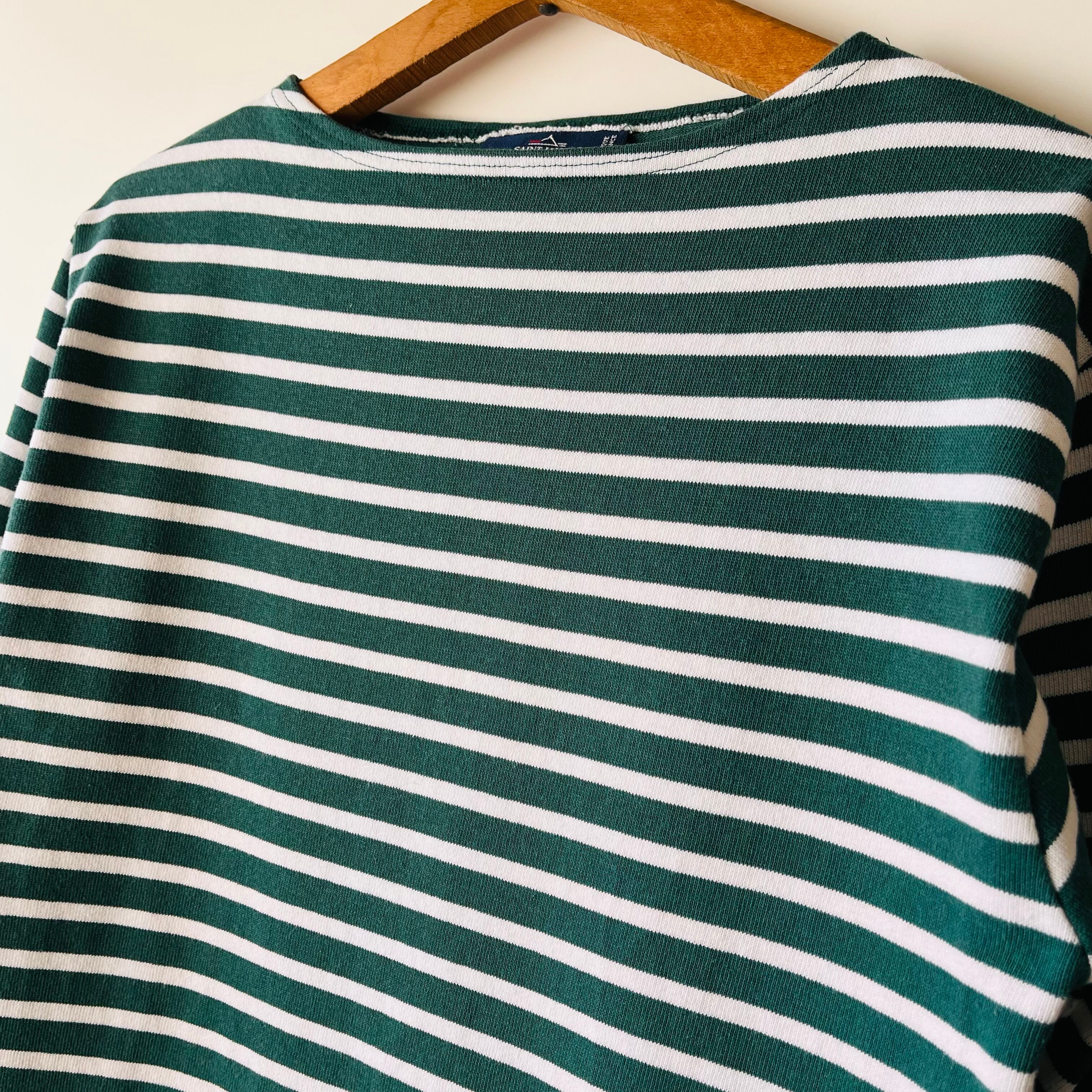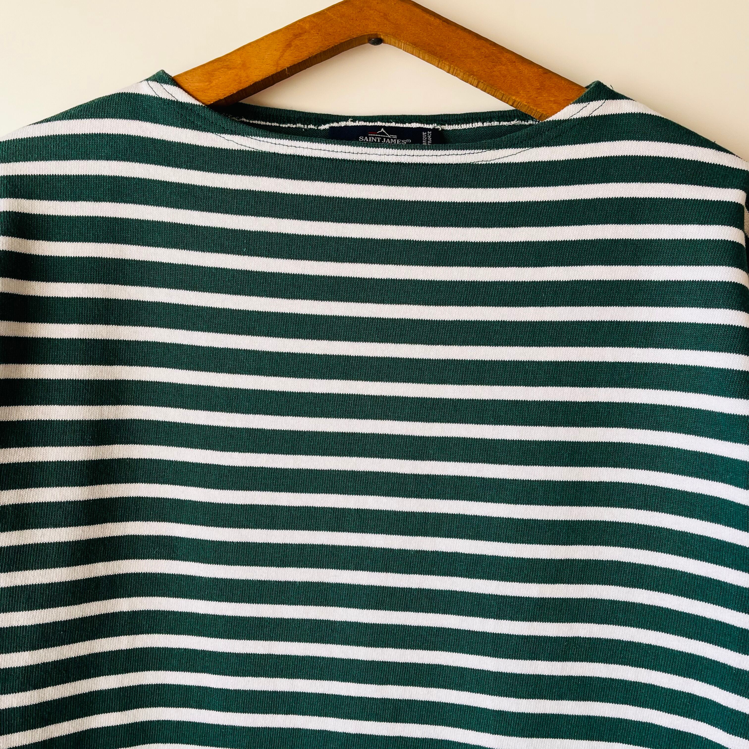 フランス発祥の老舗ブランドSAINT JAMESの代表的な商品です。グリーンとエクリュのクラシックなボーダー柄が特徴で、シンプルながらも洗練されたデザインが魅力的です。フランス北部の沿岸地域で誕生したブランドらしいマリンルックを楽しむことができる一枚です。