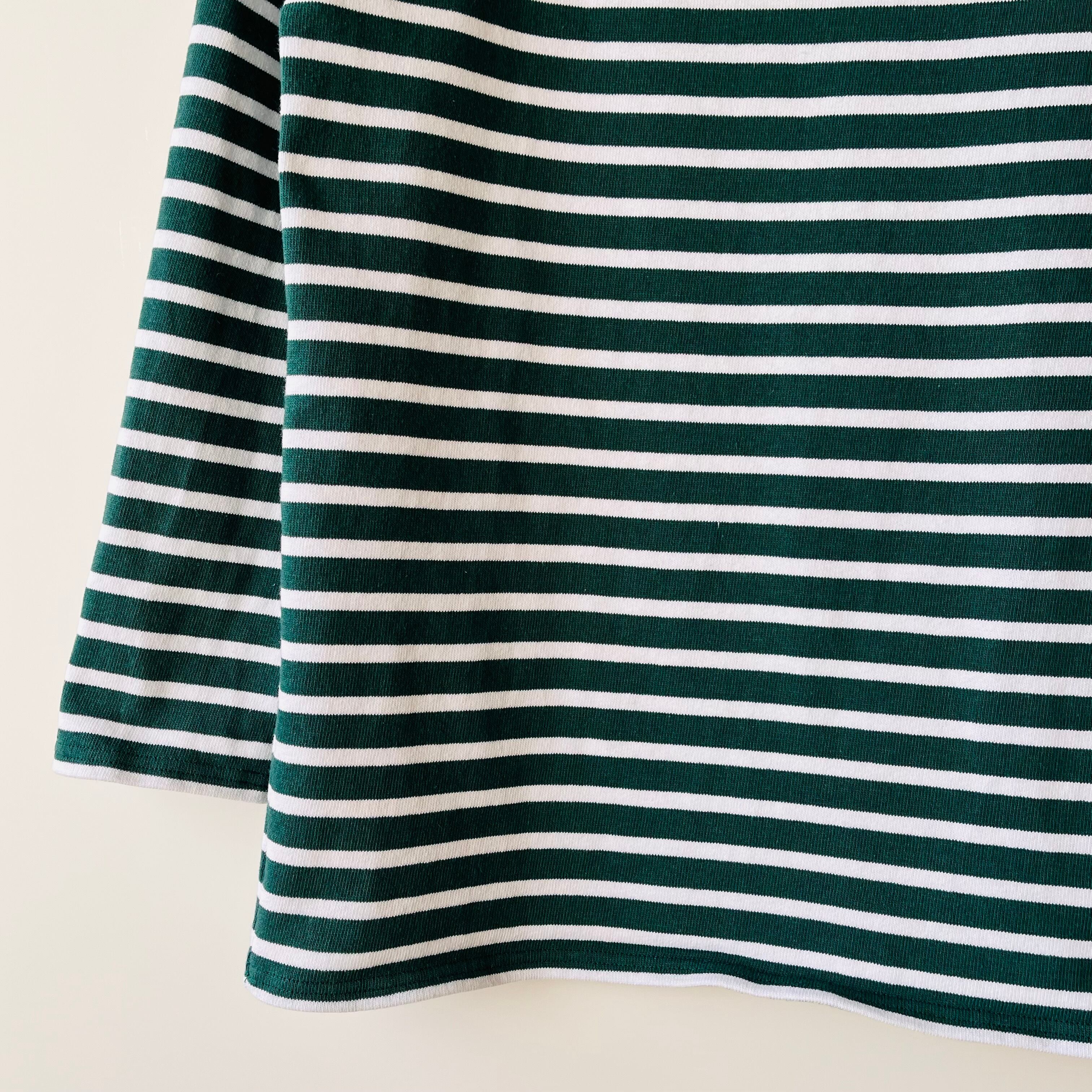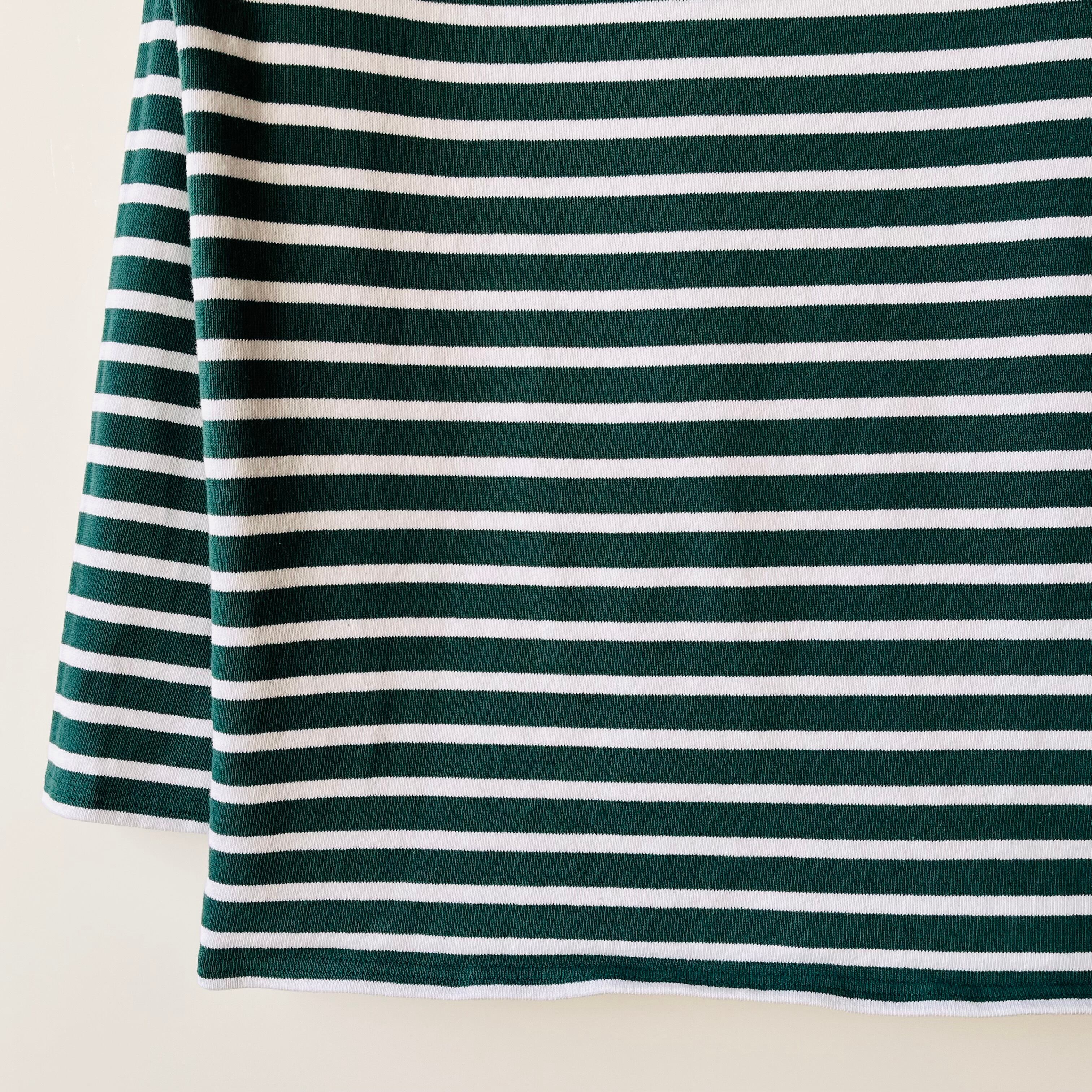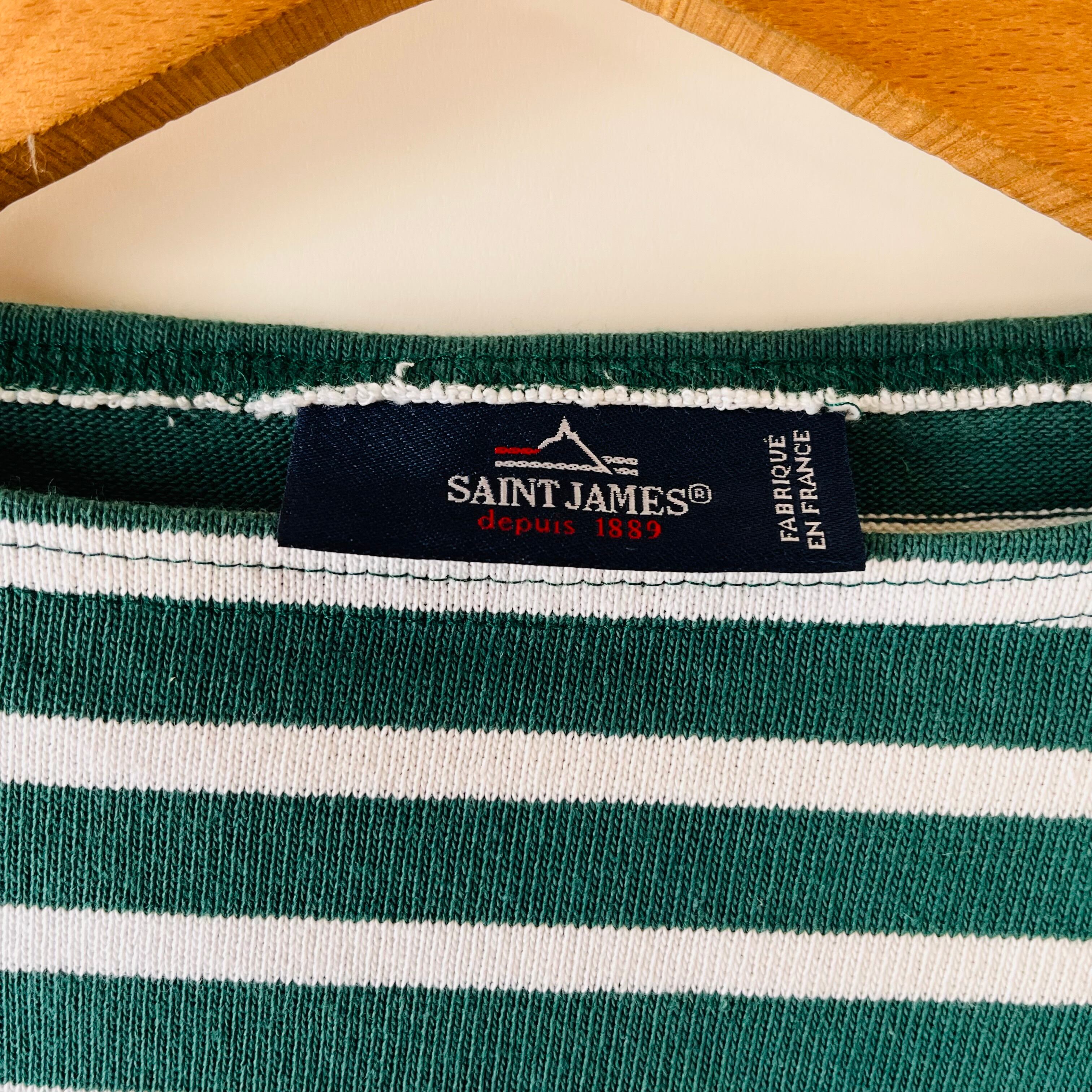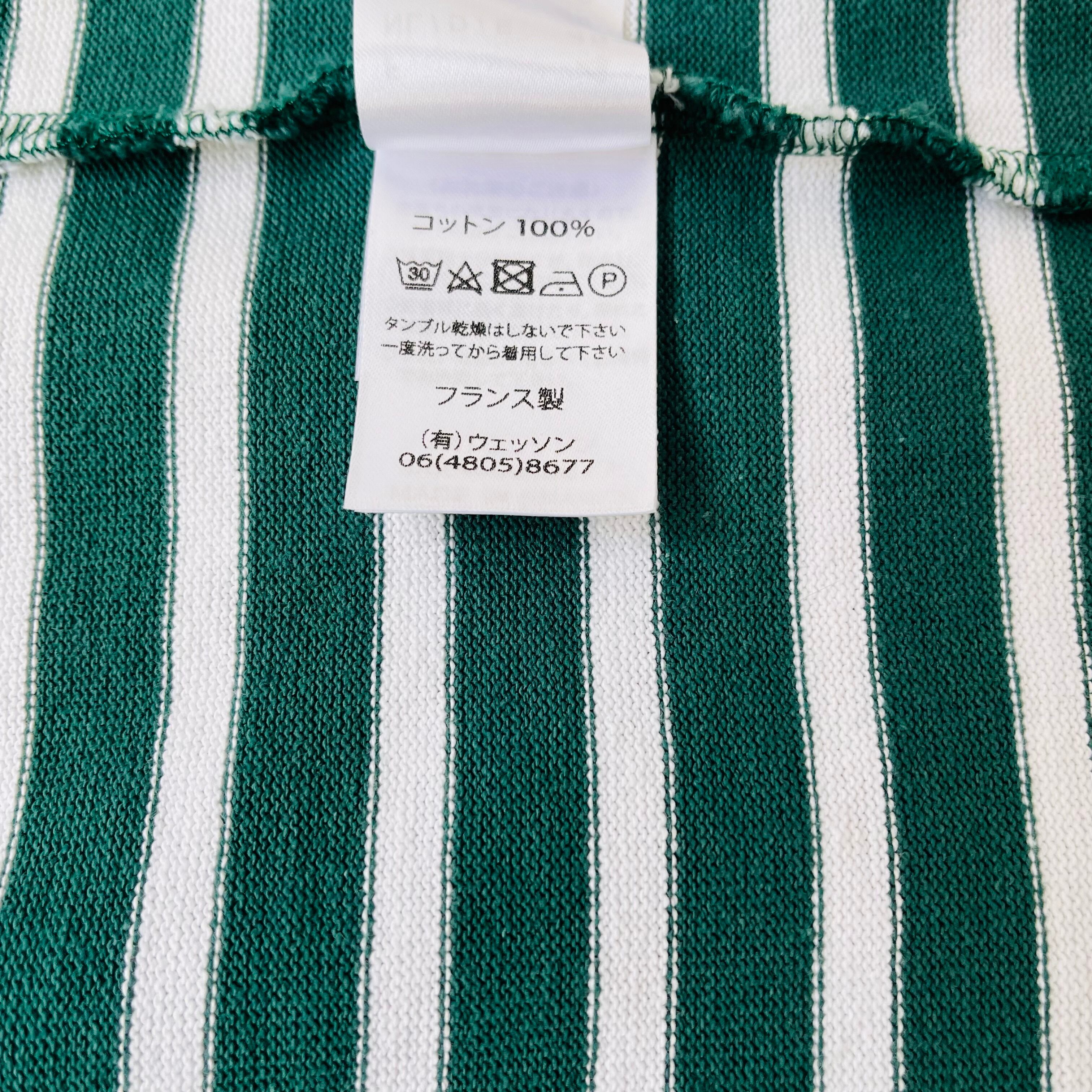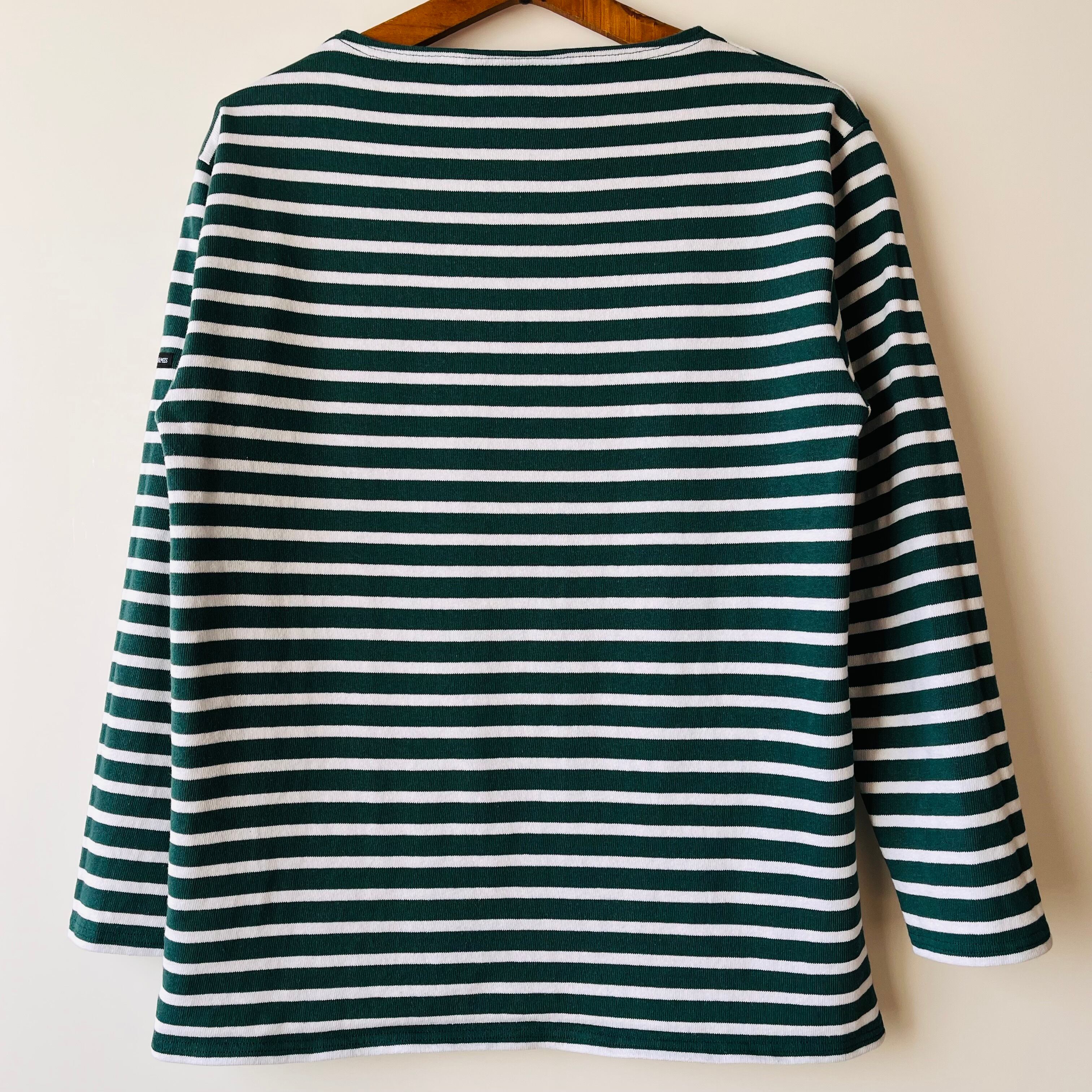 フランス発祥の老舗ブランドSAINT JAMESの代表的な商品です。グリーンとエクリュのクラシックなボーダー柄が特徴で、シンプルながらも洗練されたデザインが魅力的です。フランス北部の沿岸地域で誕生したブランドらしいマリンルックを楽しむことができる一枚です。