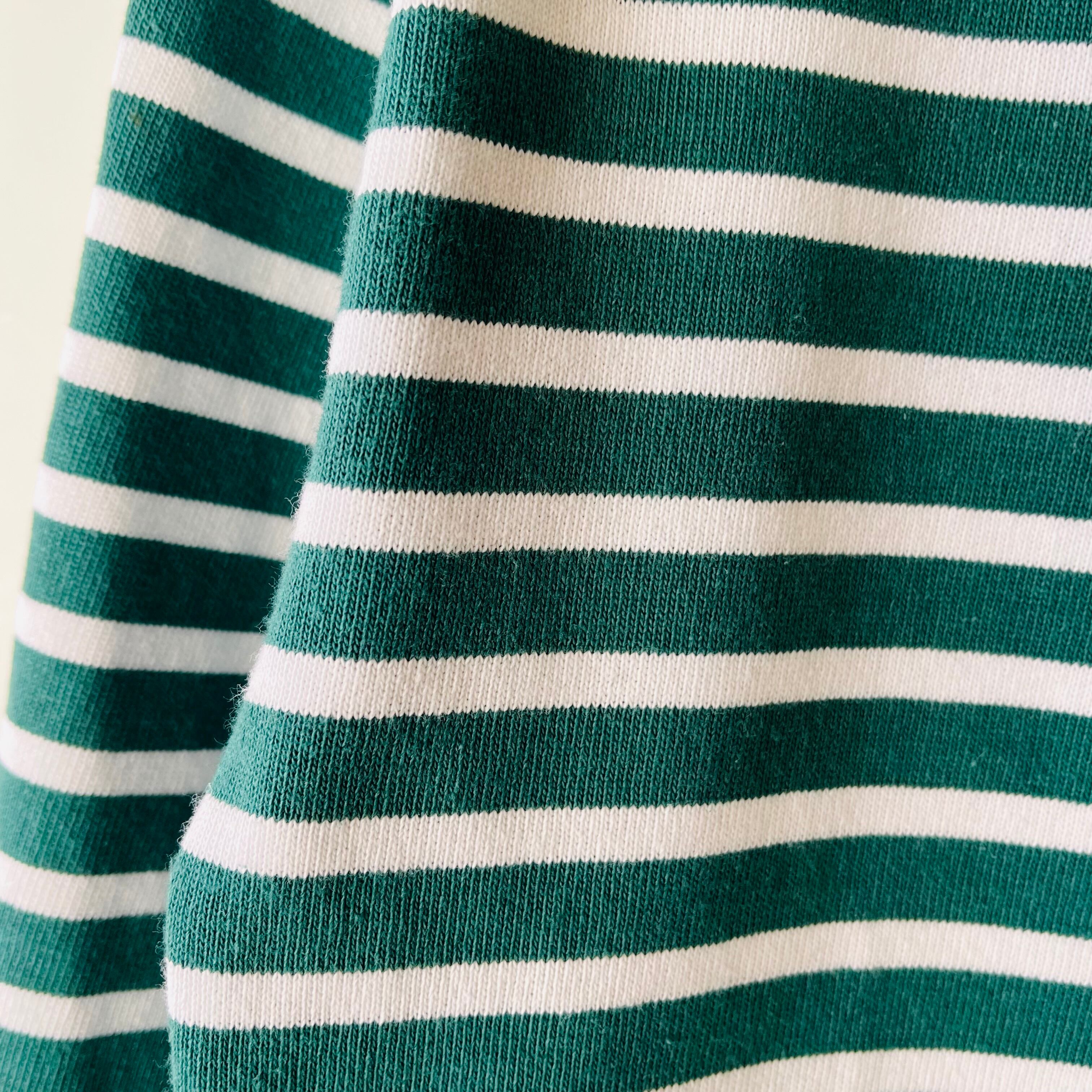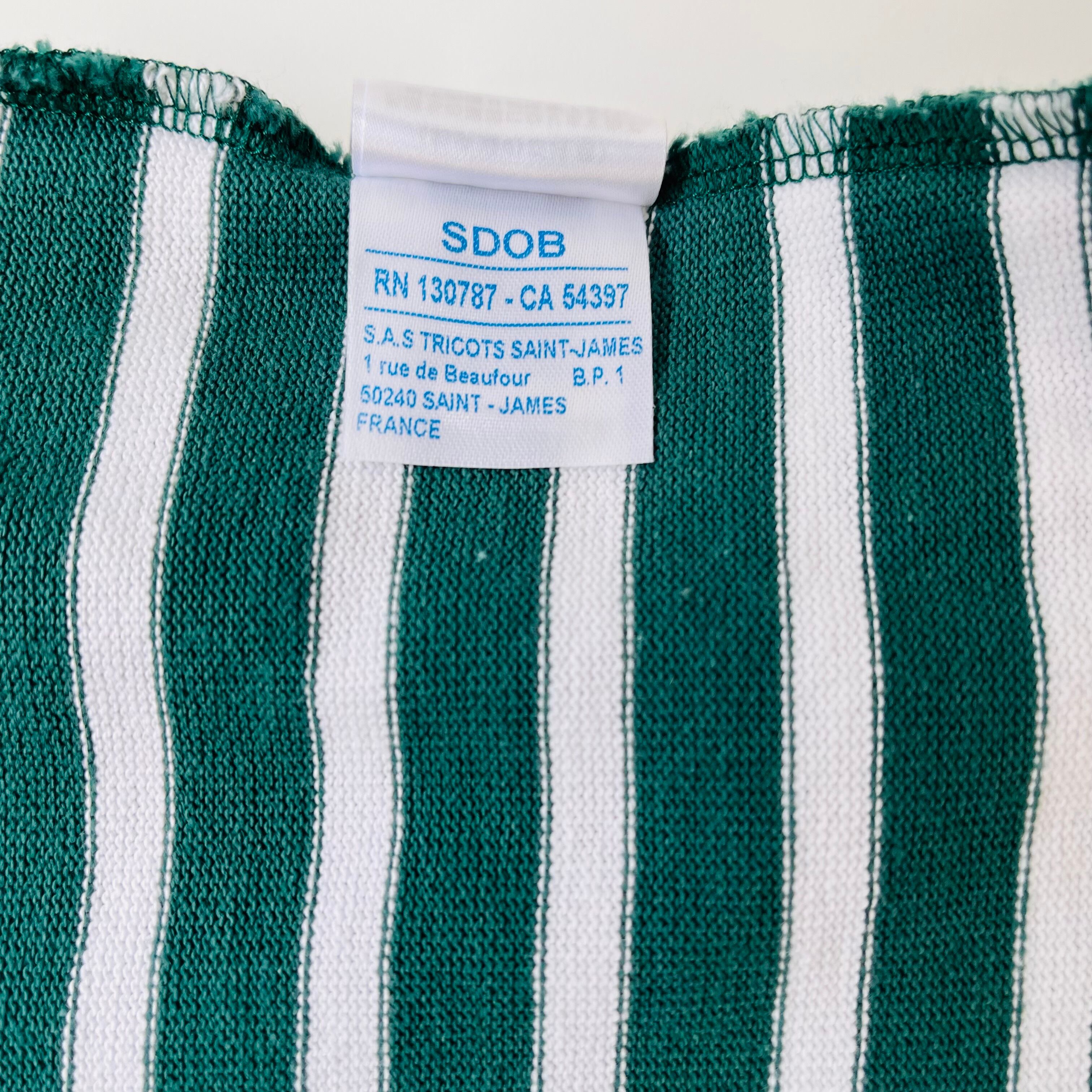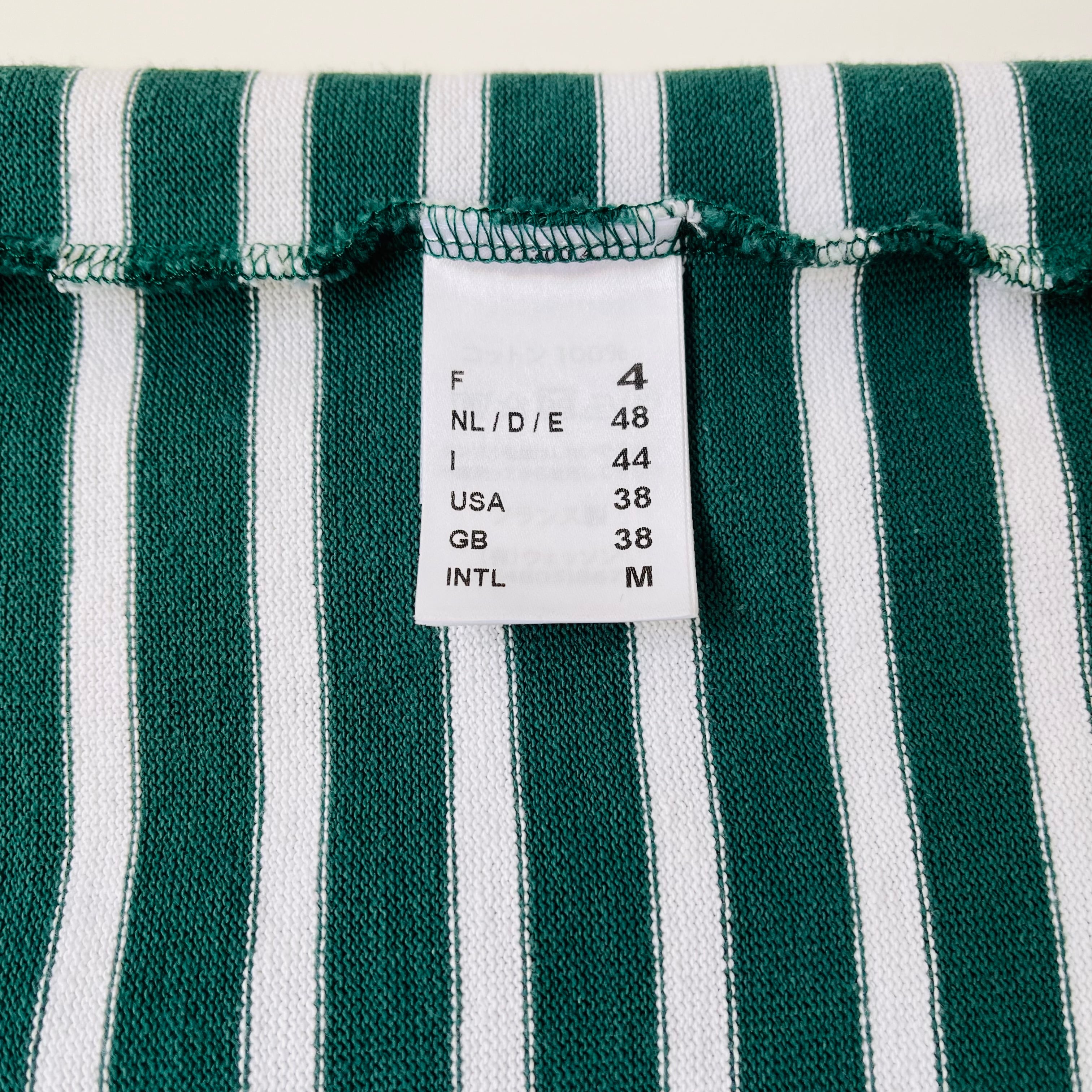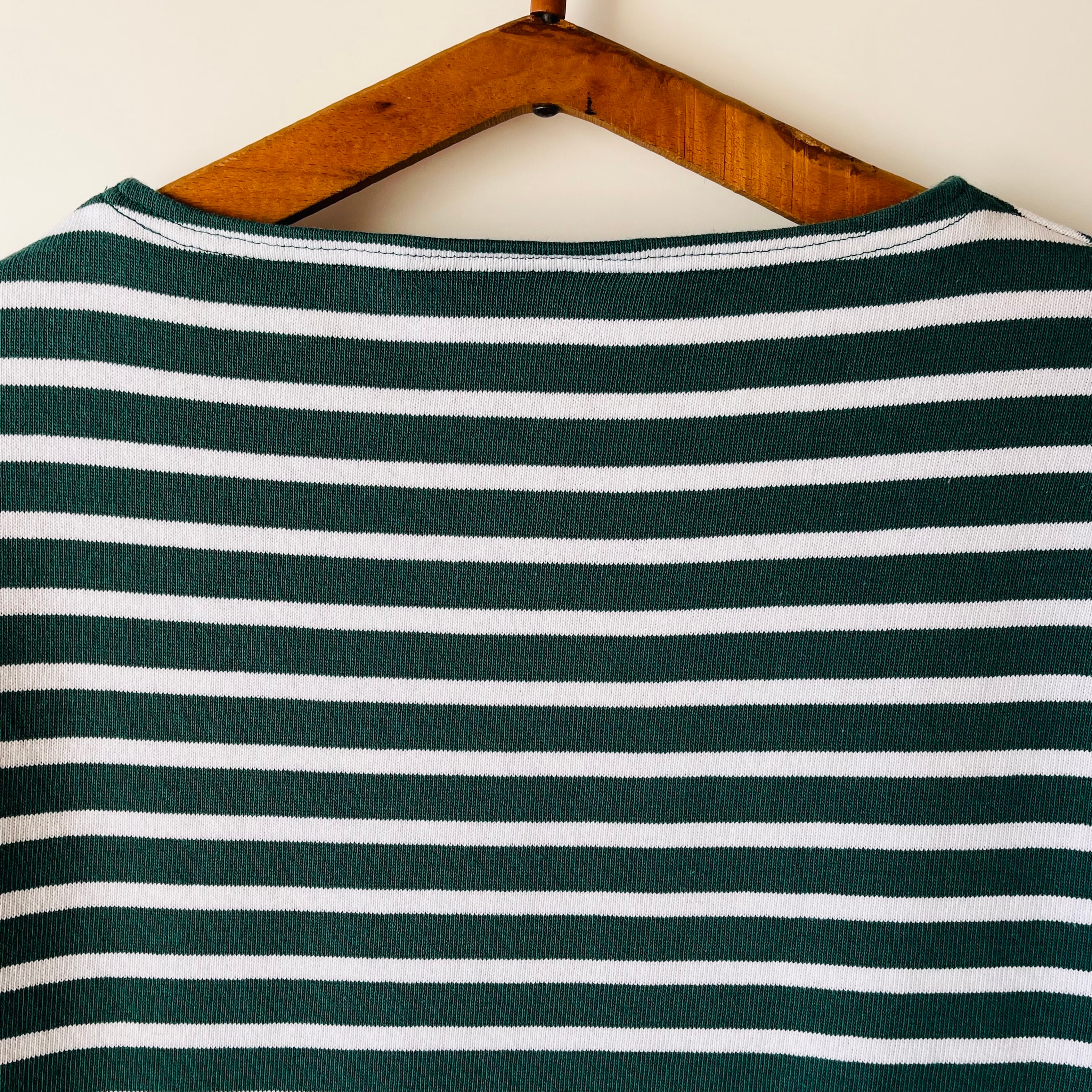 フランス発祥の老舗ブランドSAINT JAMESの代表的な商品です。グリーンとエクリュのクラシックなボーダー柄が特徴で、シンプルながらも洗練されたデザインが魅力的です。フランス北部の沿岸地域で誕生したブランドらしいマリンルックを楽しむことができる一枚です。