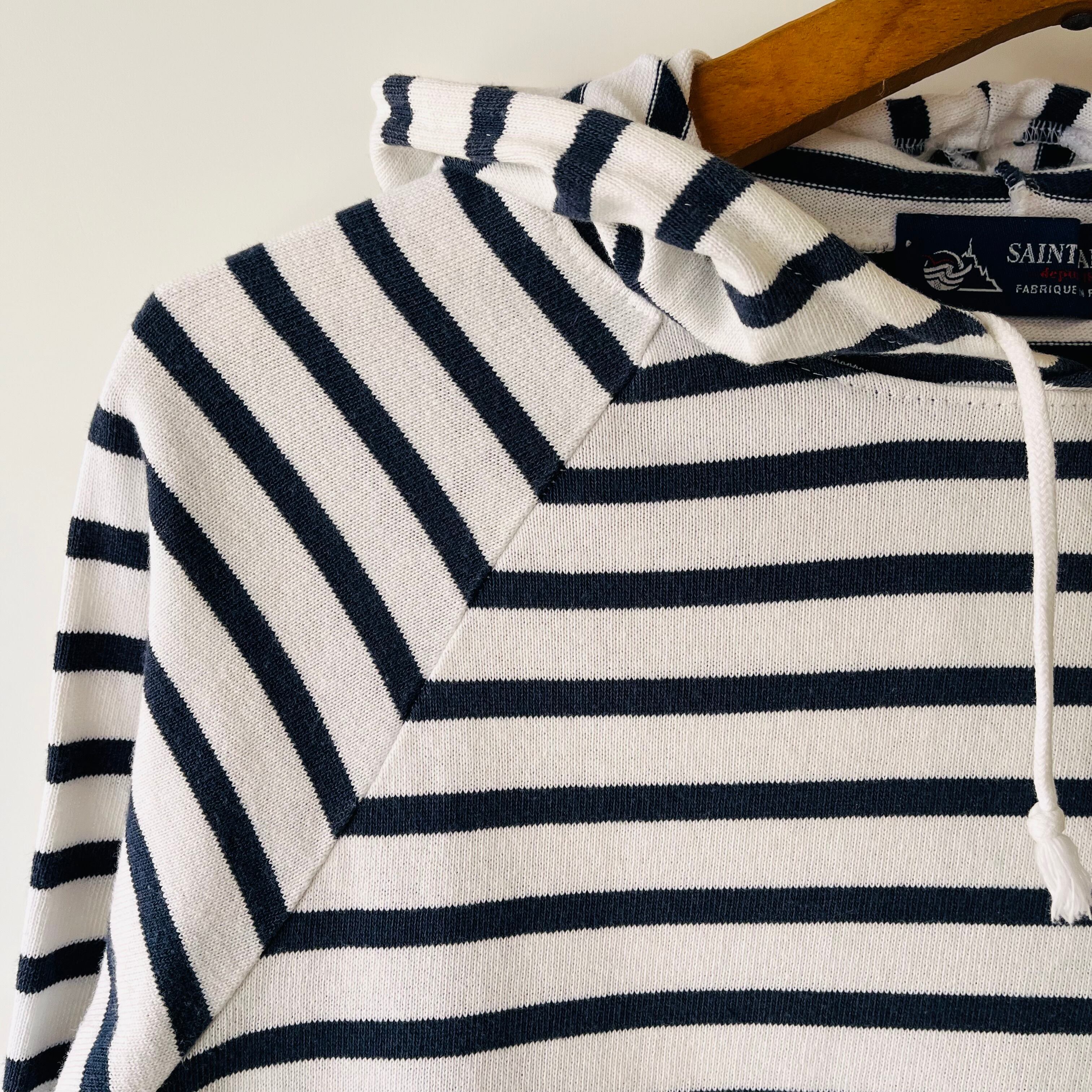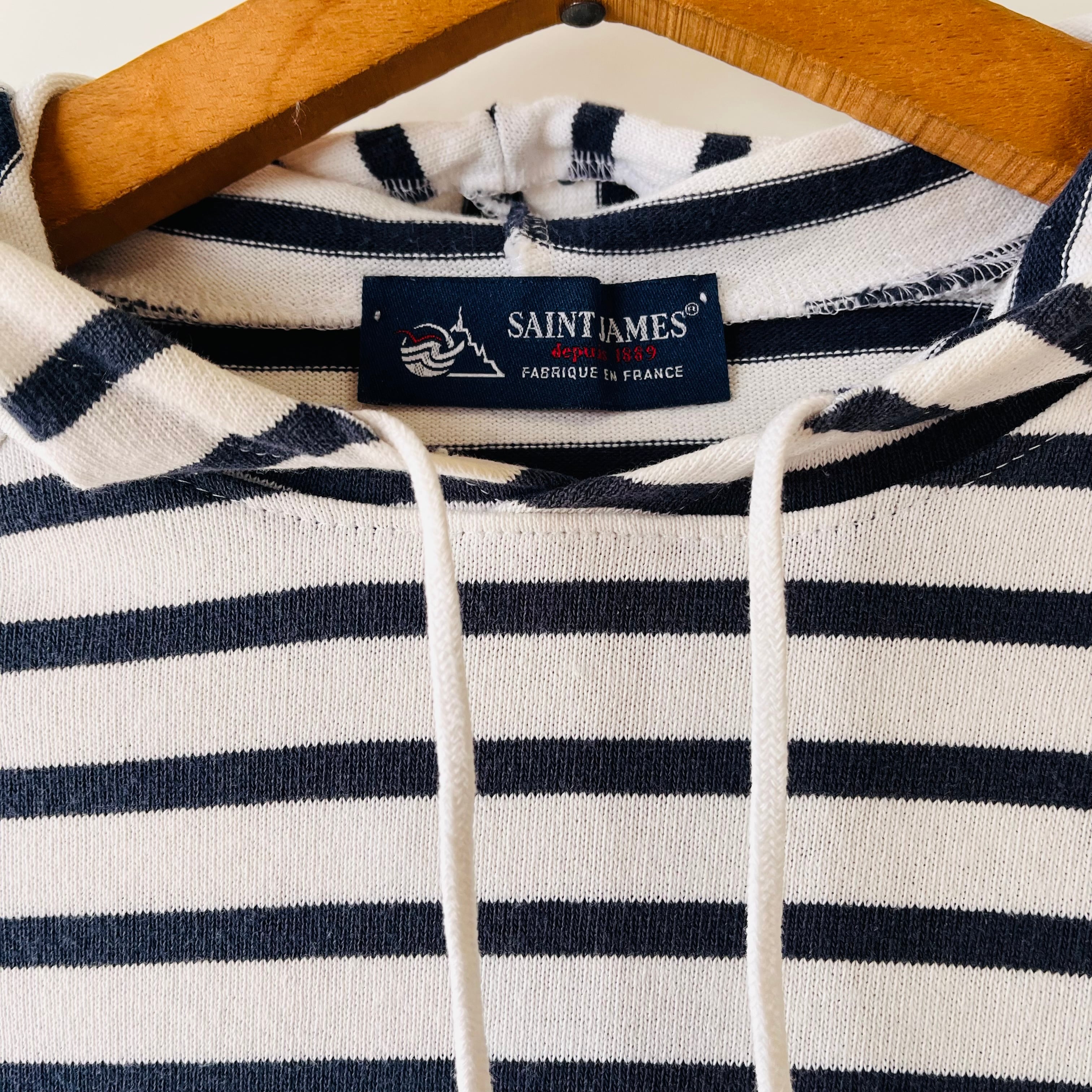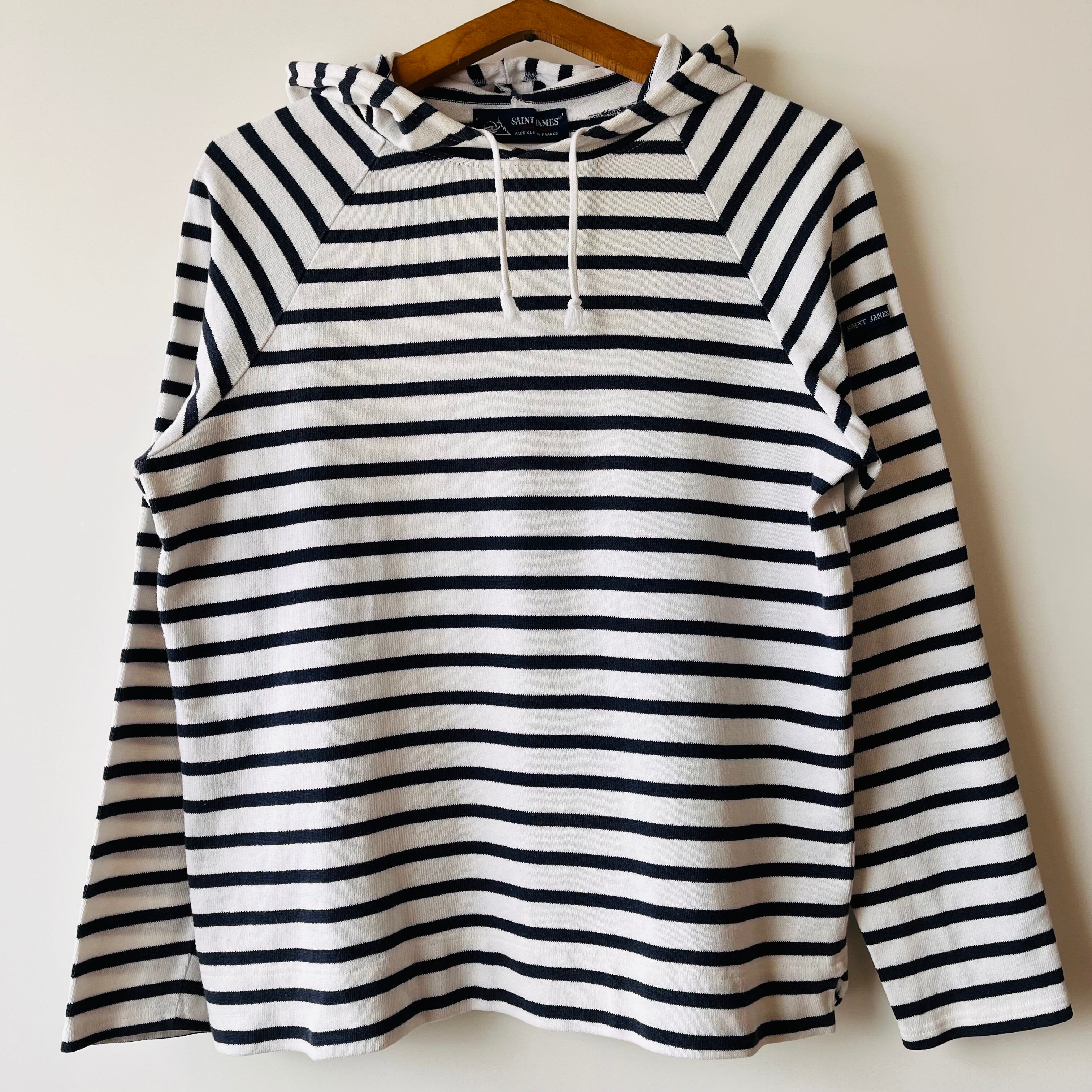 フランス製セントジェームスのプルオーバーフーディです。クラシックなホワイトとネイビーの配色が特徴で、さりげなくカジュアルな雰囲気を演出します。洗練されたデザインは、日常のコーディネートに取り入れやすく、どんなスタイルにもマッチします。
