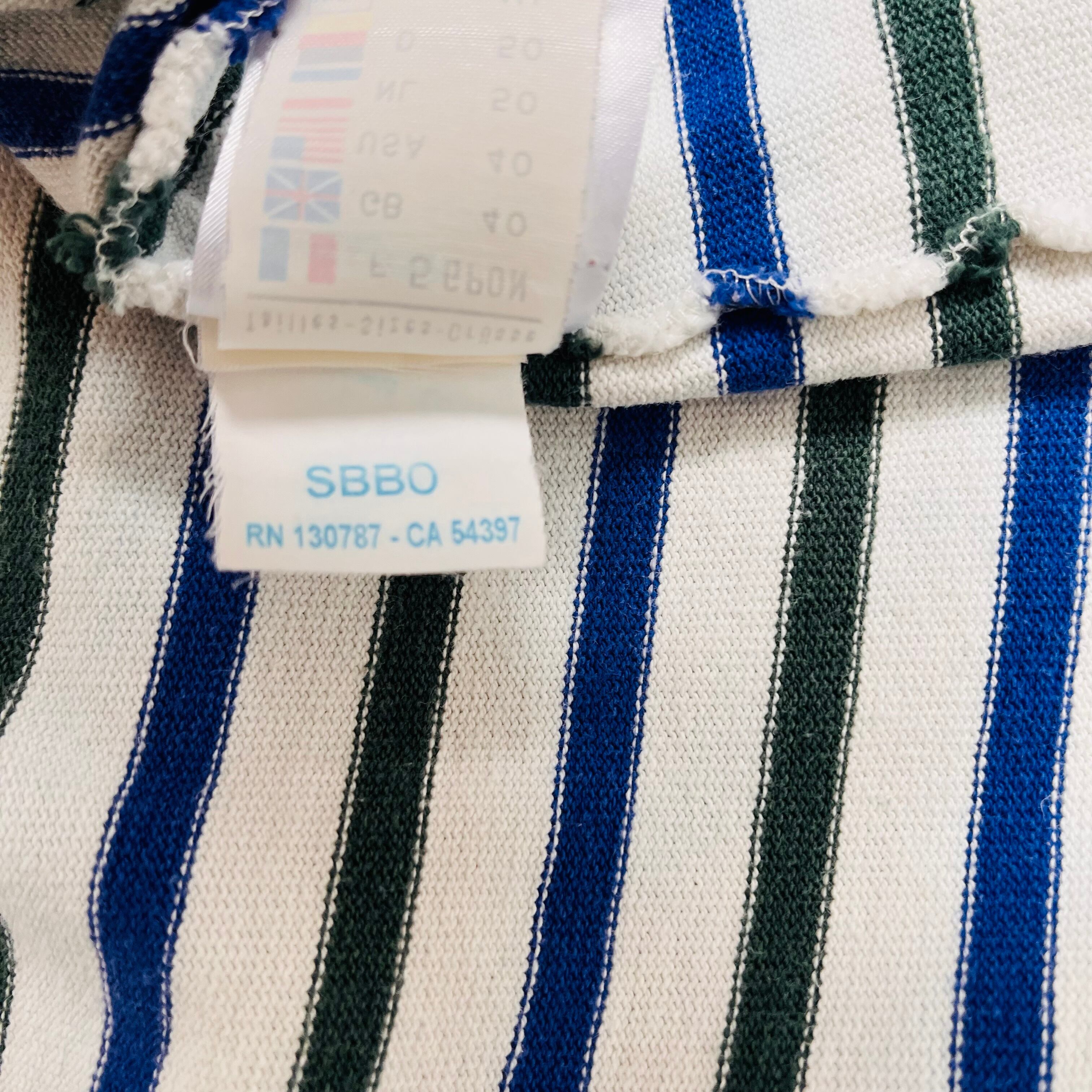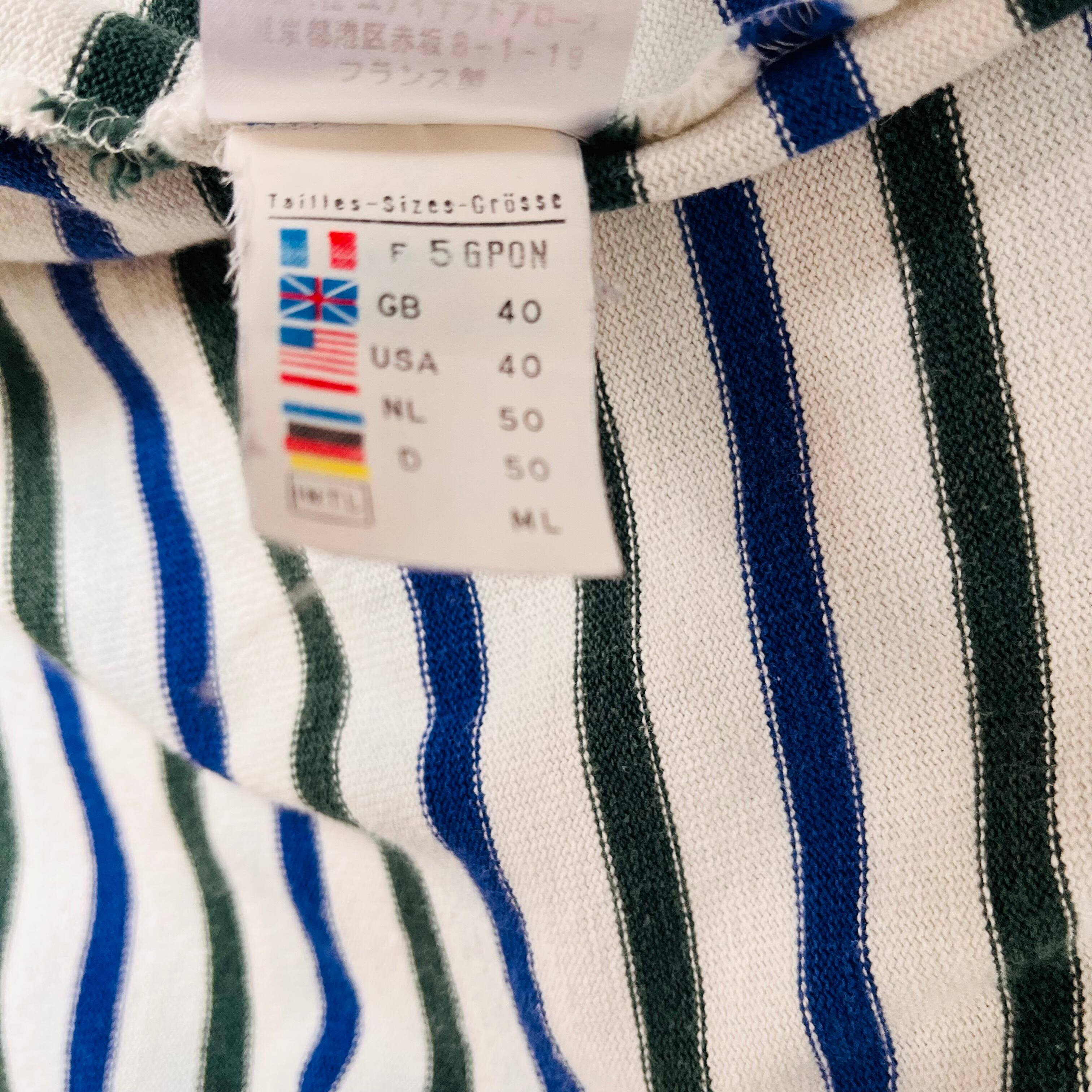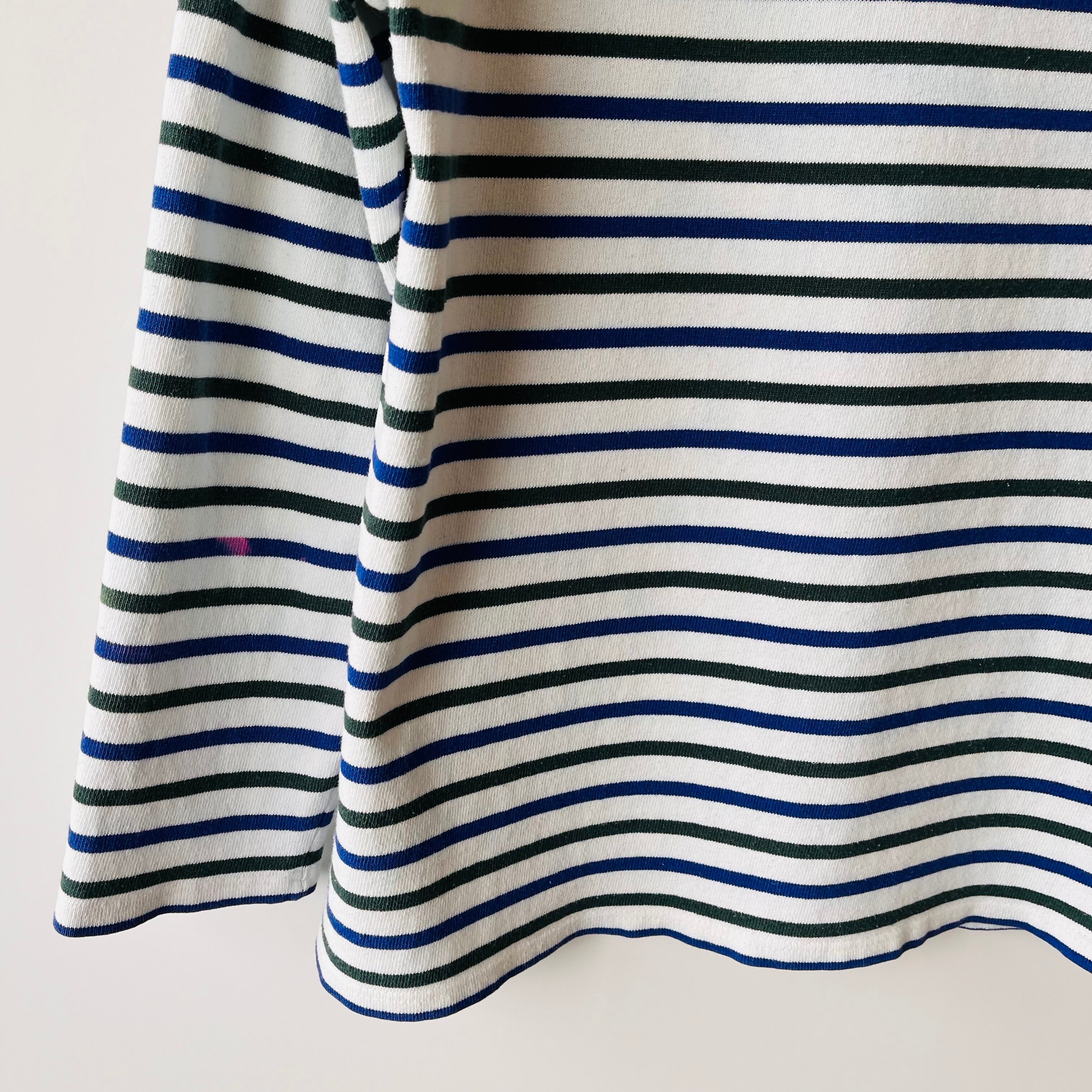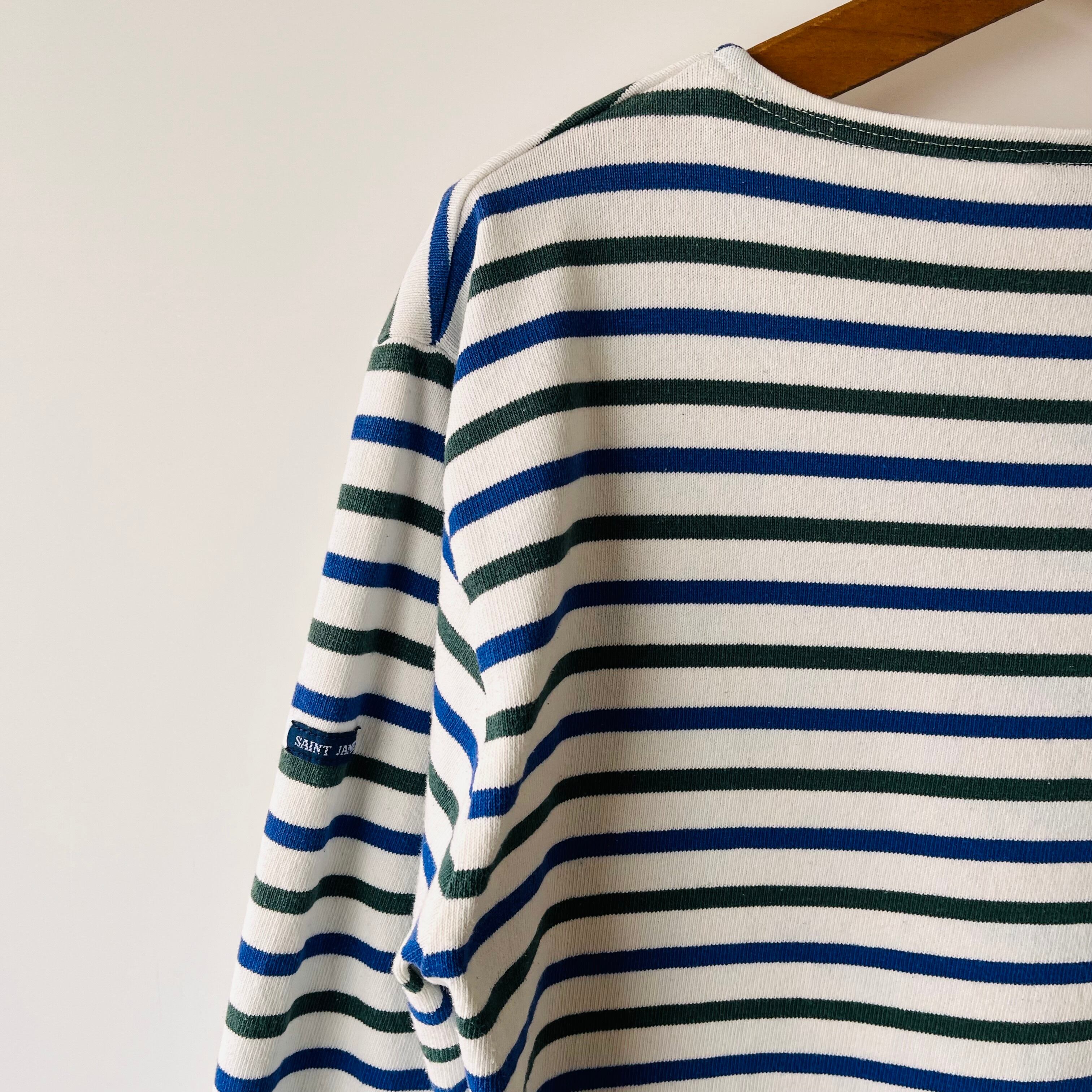 フランス製セントジェームスのウエッソンです。ホワイト、ブルー、ダークグリーンのコントラストが美しく、シンプルながらも目を引くデザインが魅力の一着です。日常使いやカジュアルなシーンで大活躍するアイテムです。