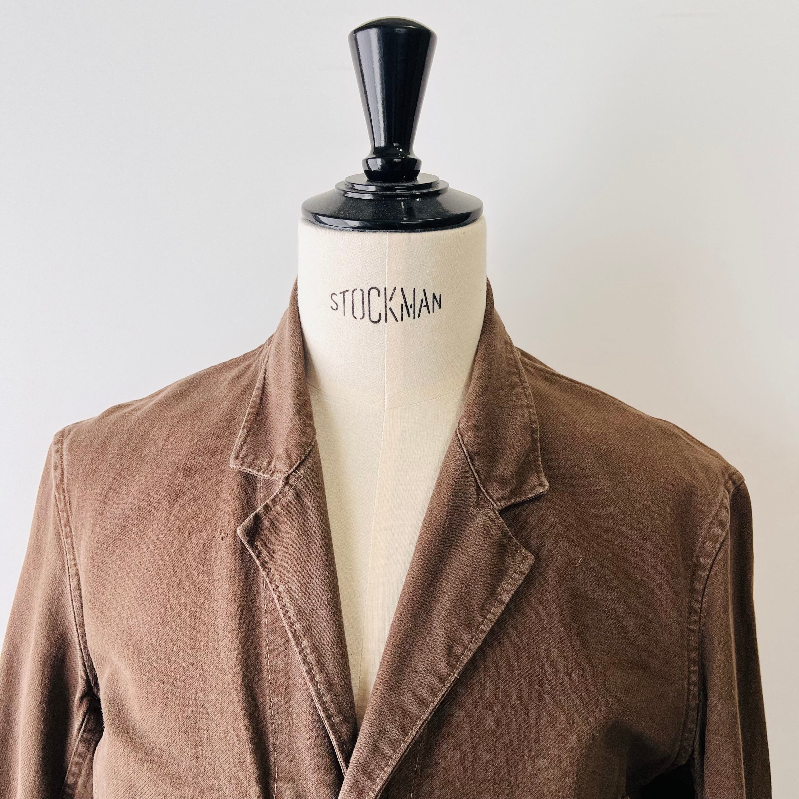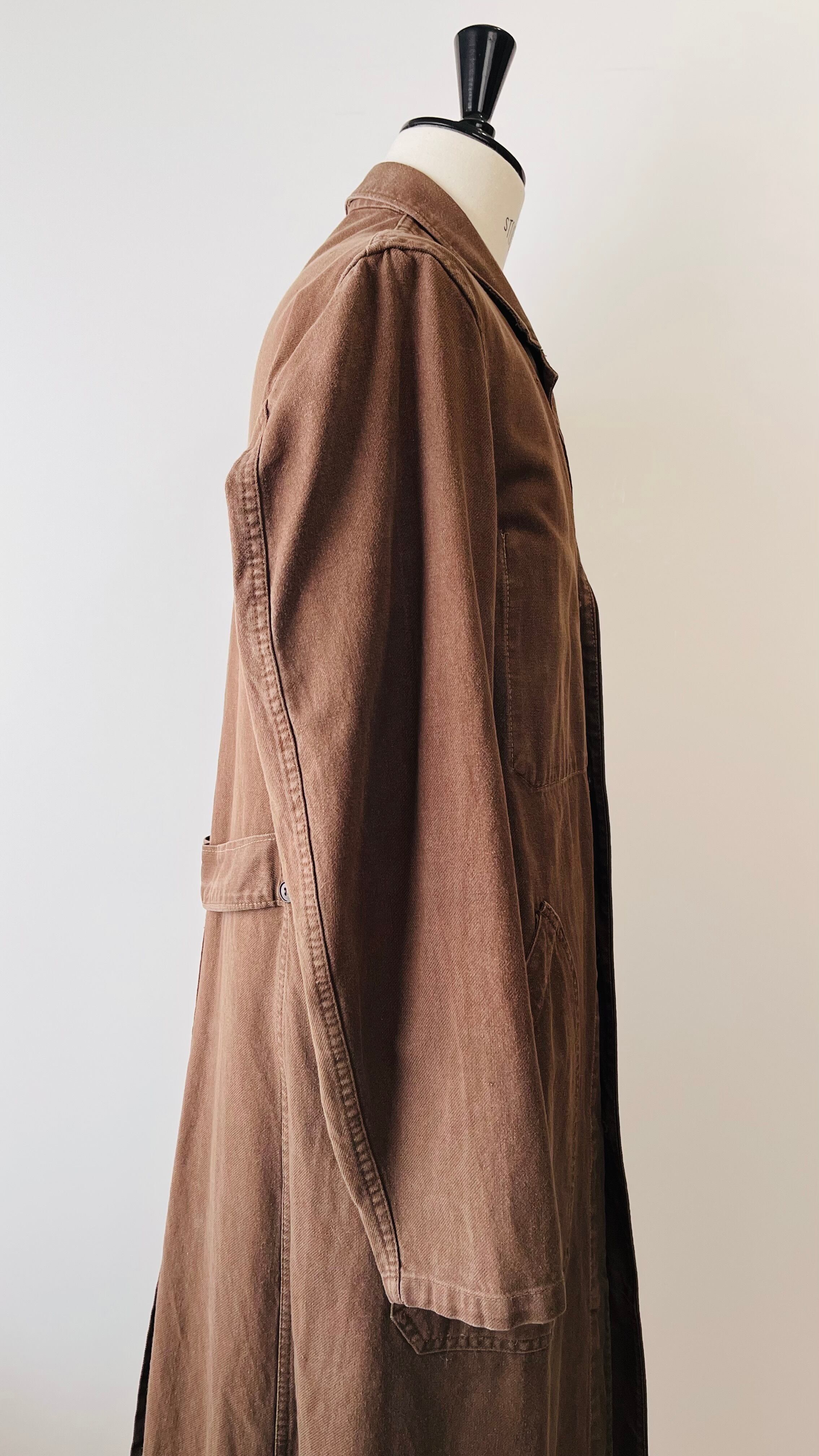 50〜60年代のユーロヴィンテージ・ブラウンワークコートです。シンプルながらも独自の存在感を持つデザインが特徴で、カジュアルな日常使いから特別なシーンまで広く活躍できる一着です。