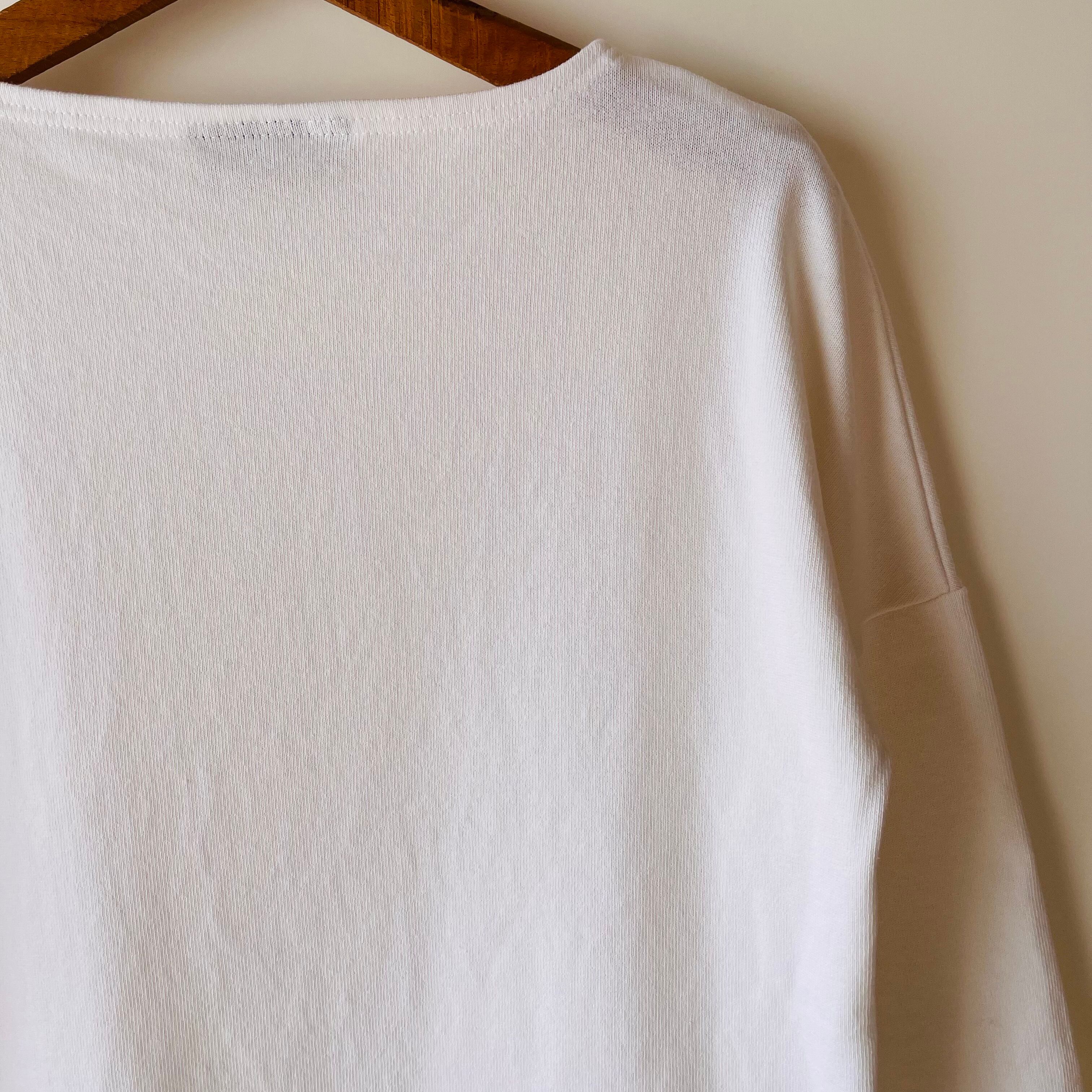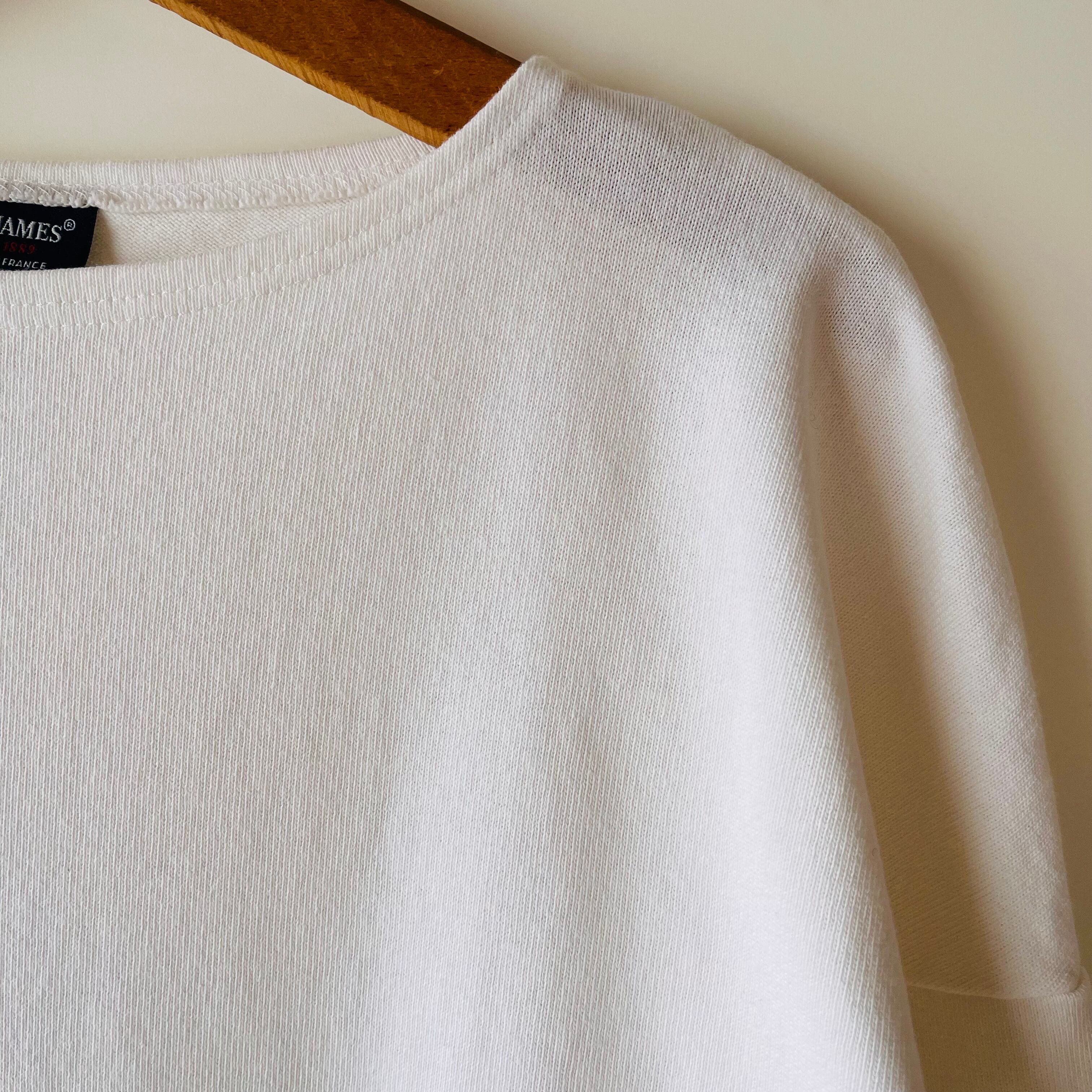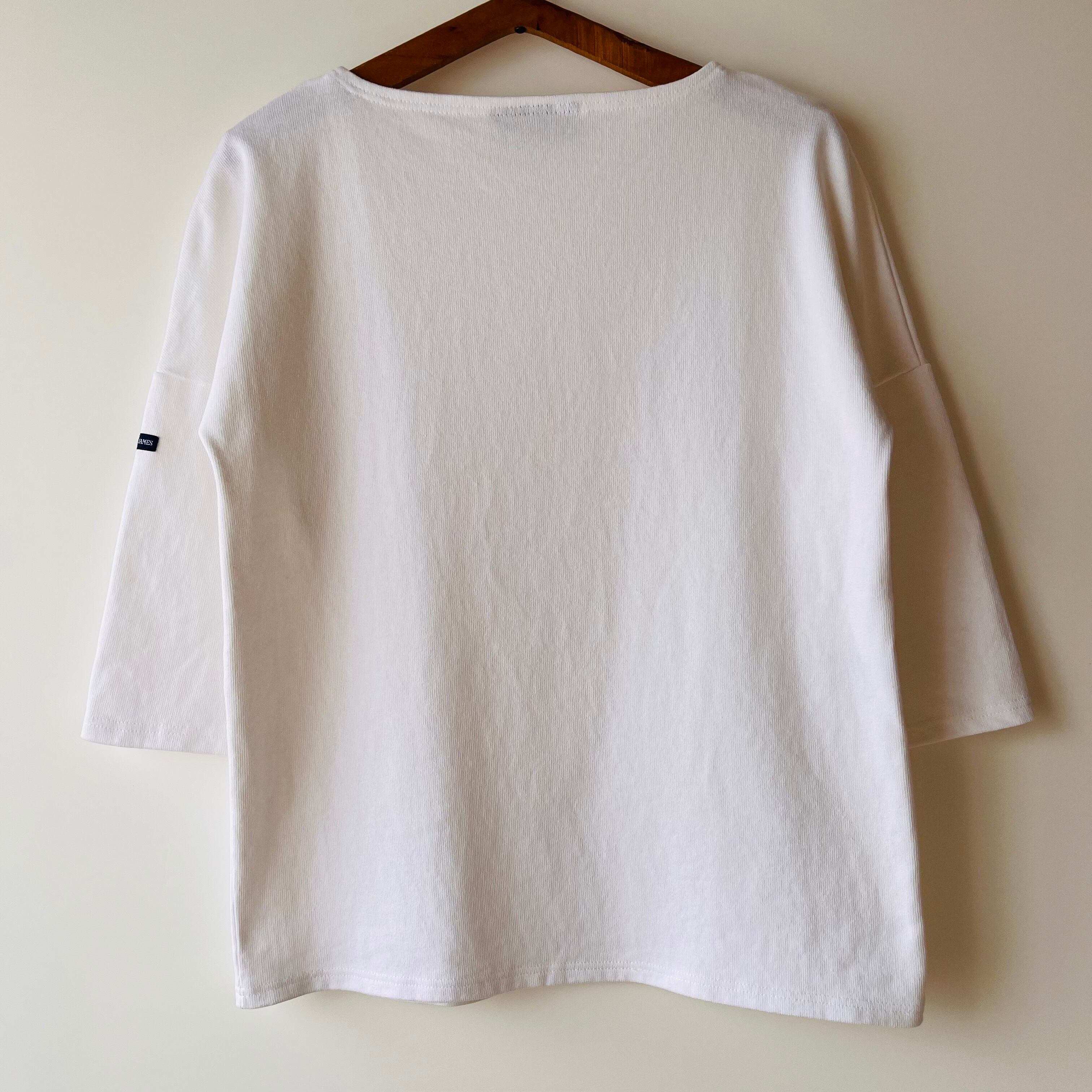 フランス製セントジェームスの7分丈カットソーです。シンプルなホワイトカラーの色合いが魅力で、シンプルながらもスタイリッシュなデザインが特徴の一着です。日常使いやカジュアルなシーンで活躍し、多彩なスタイリングに対応できます。
