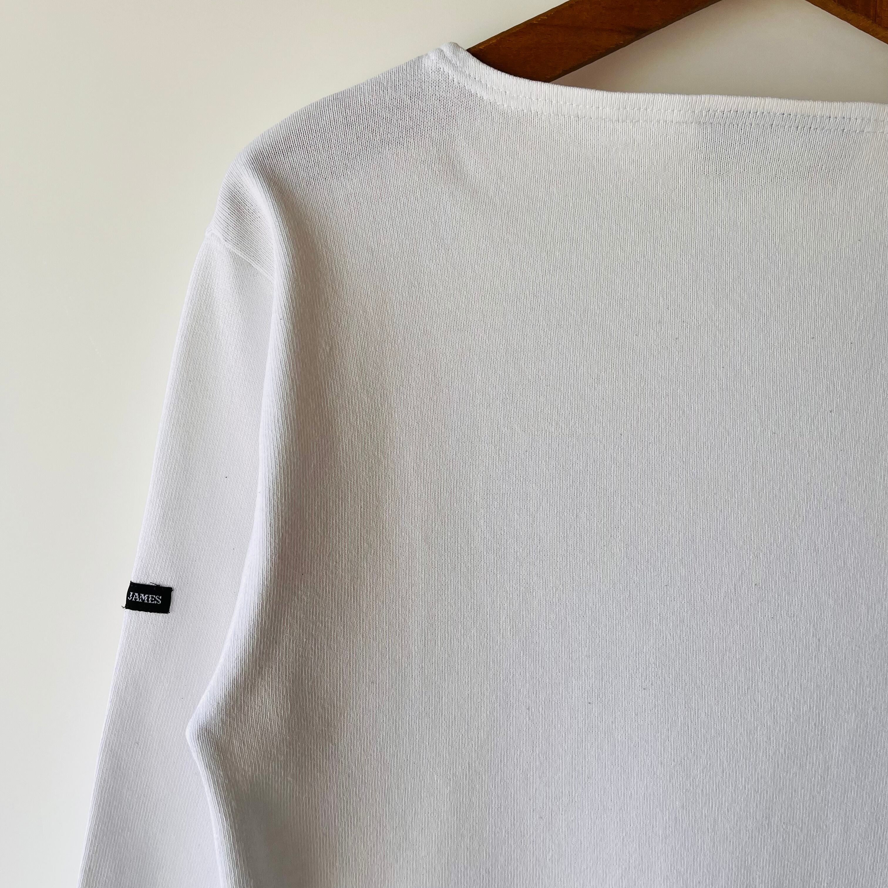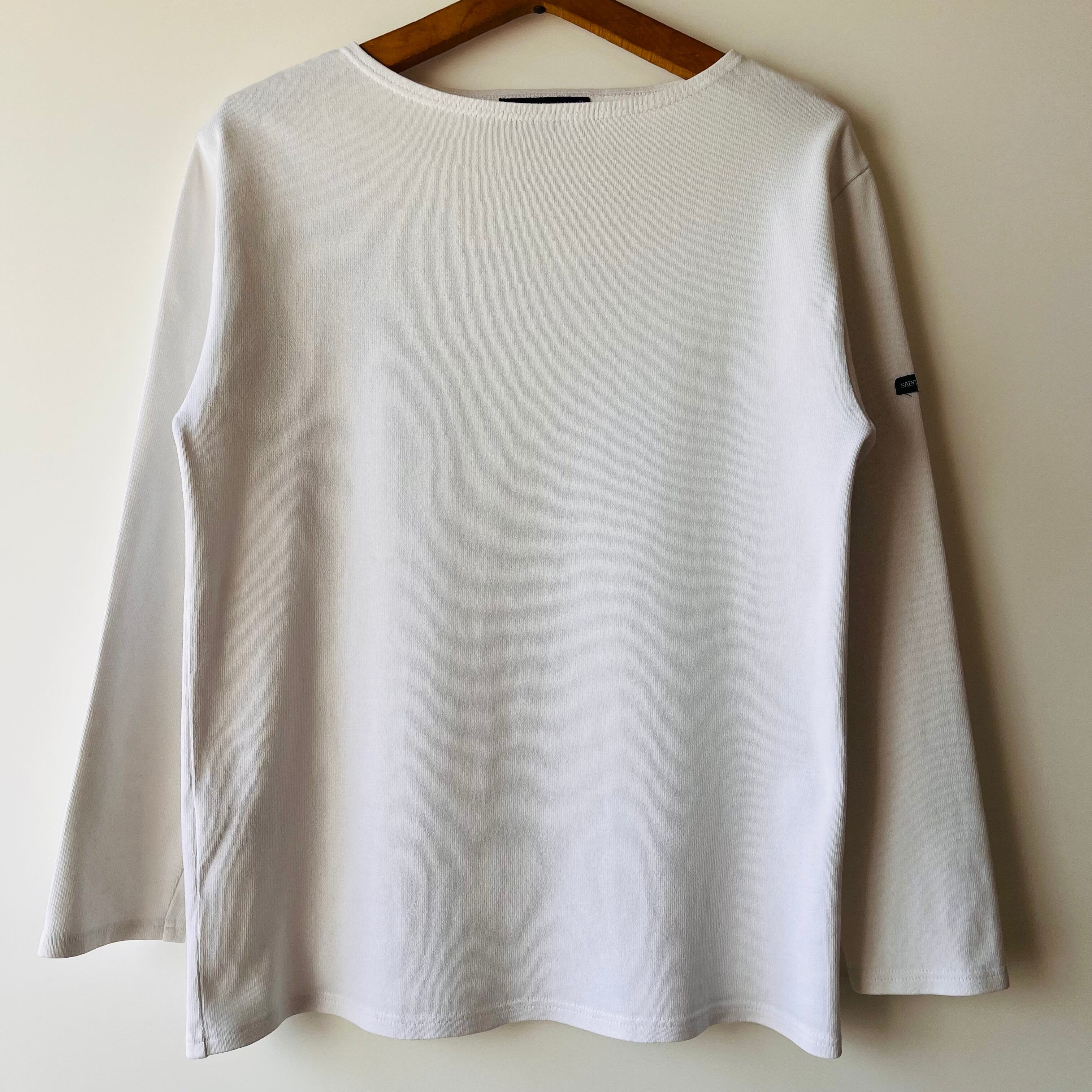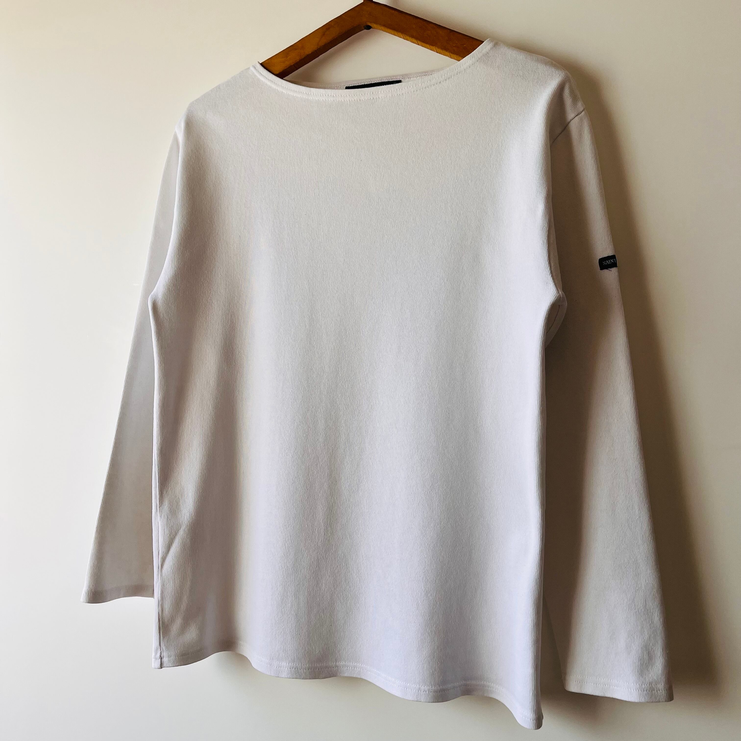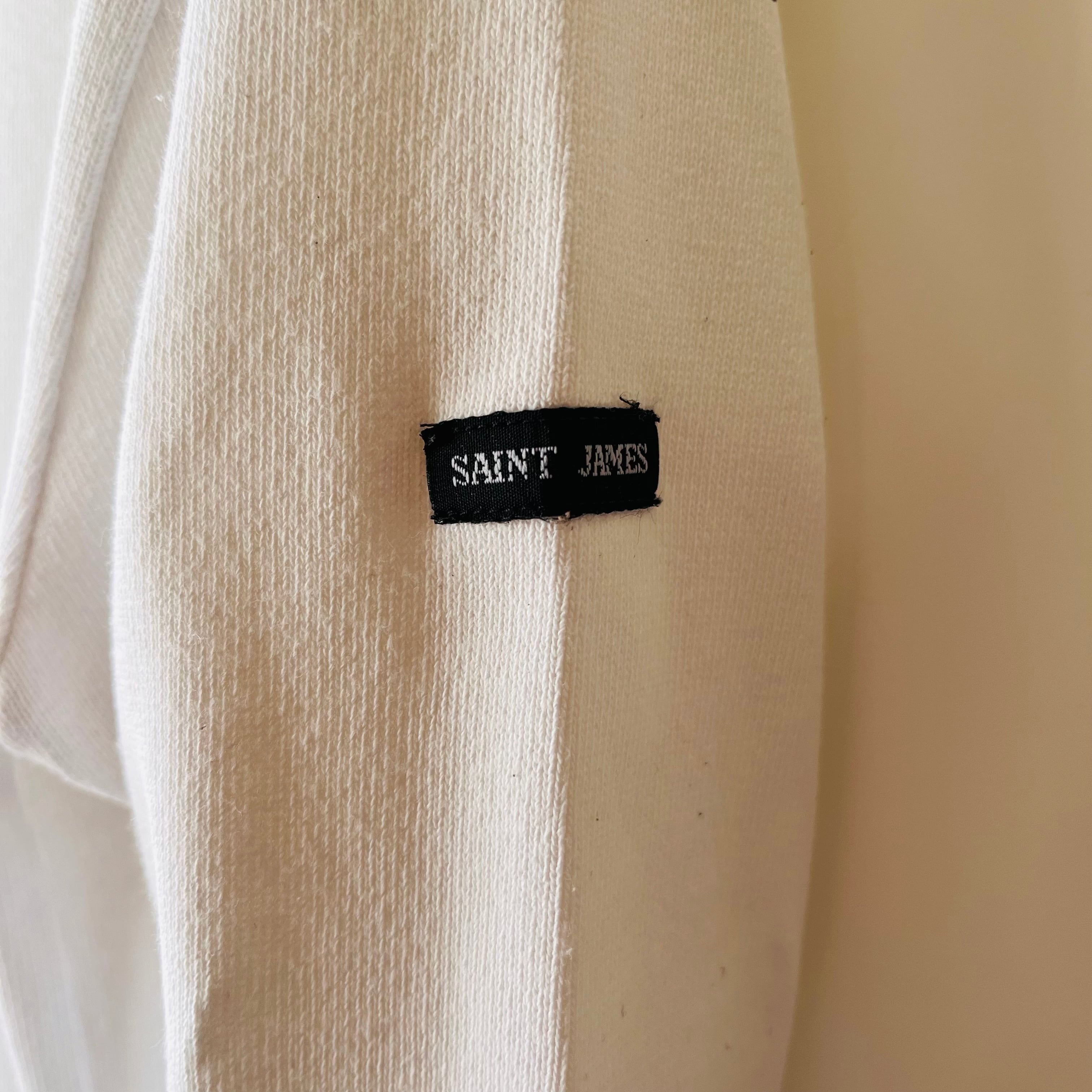 フランス製セントジェームスのウエッソンです。無地のホワイトカラーで、シンプルながらもスタイリッシュなデザインが特徴の一着です。日常使いやカジュアルなシーンで活躍し、多彩なスタイリングに対応できます。