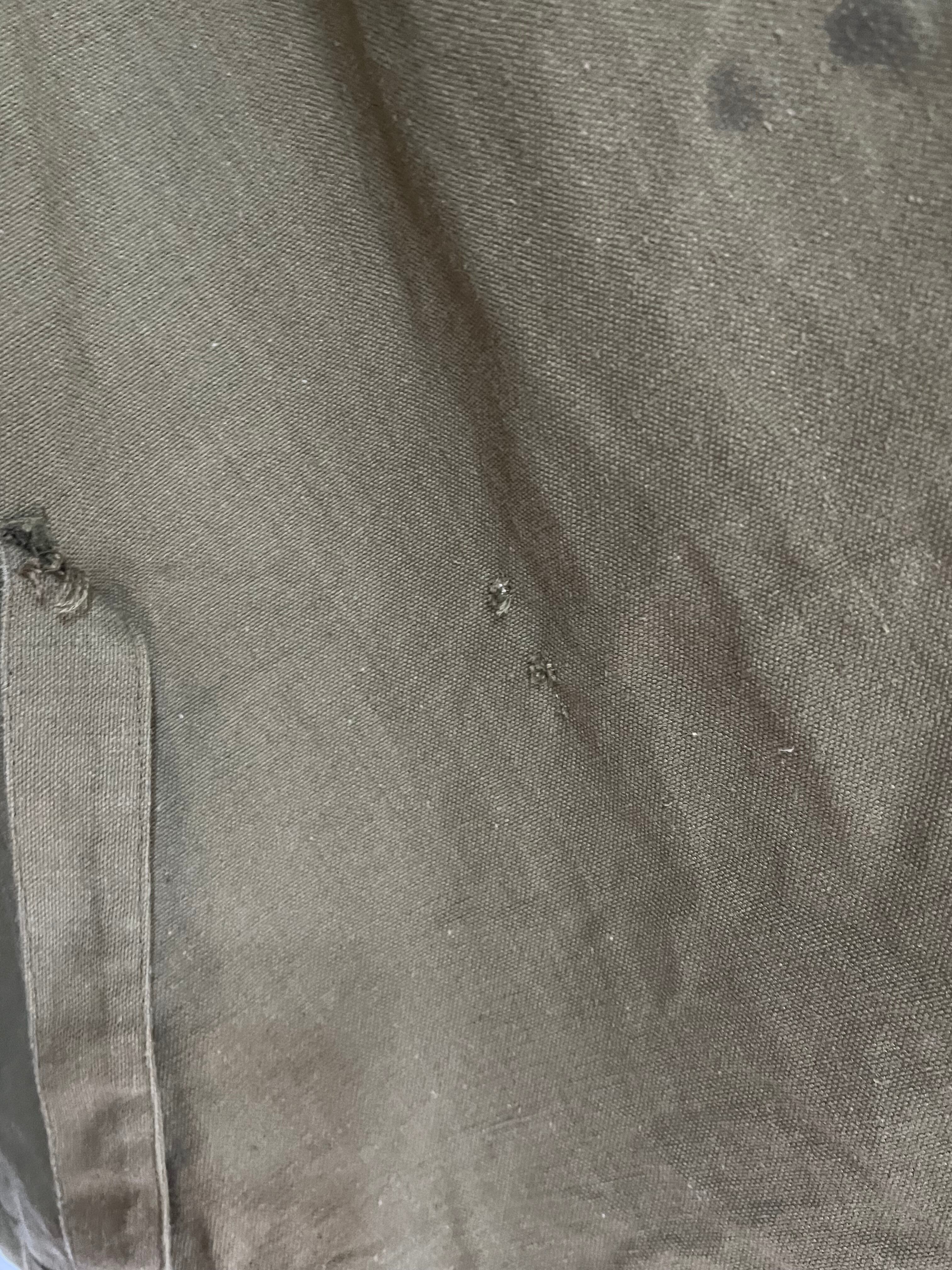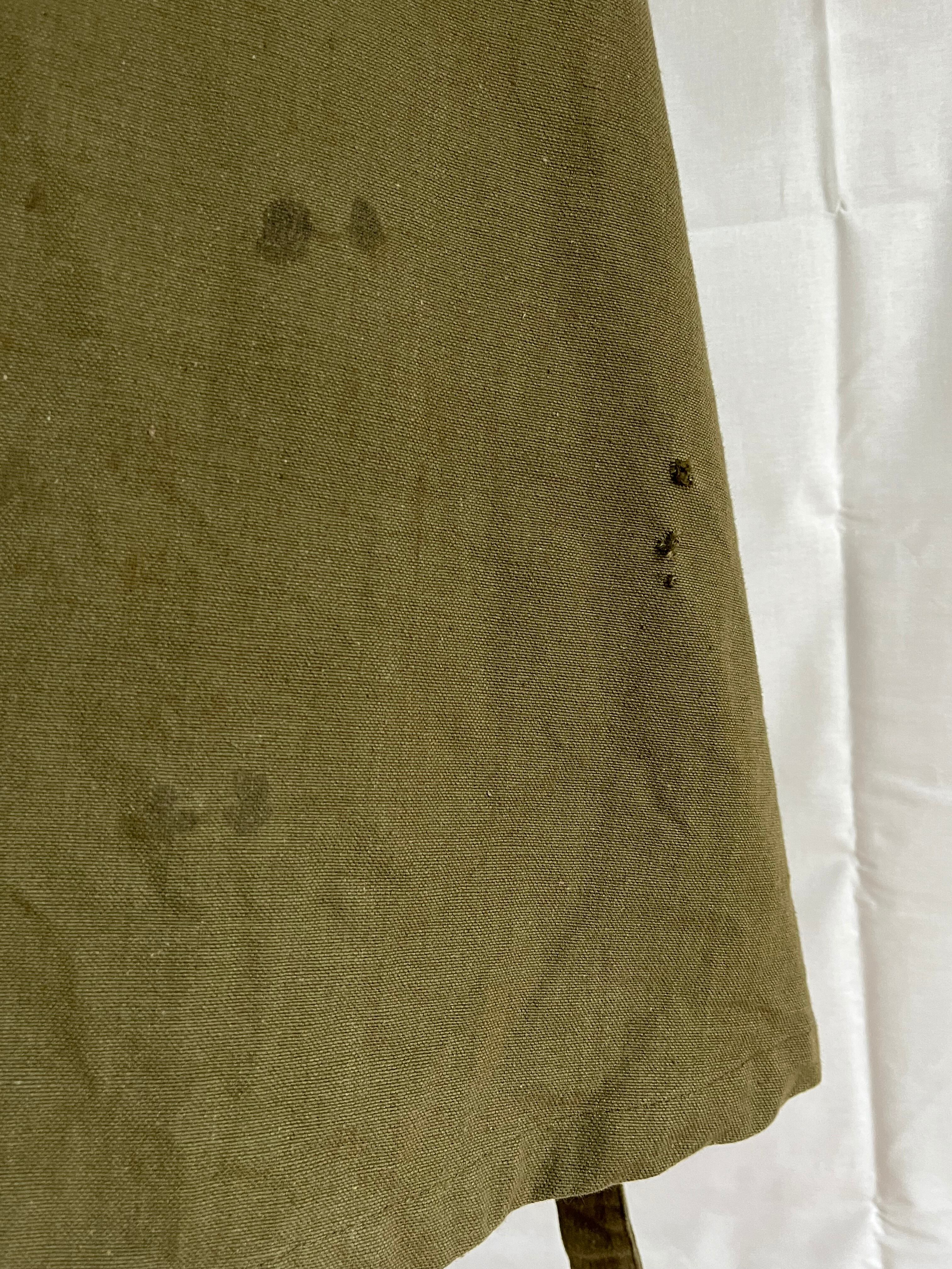 状態はフロント部の第4ボタンの欠損、左右それぞれの裾に汚れ、左裾付近の破れなどあります。生地にはまだまだハリがあり、雰囲気抜群です。古着慣れされている方なら着用可能かと思います。羽織るだけで迫力があり、存在感のある1着です。是非ご検討ください。