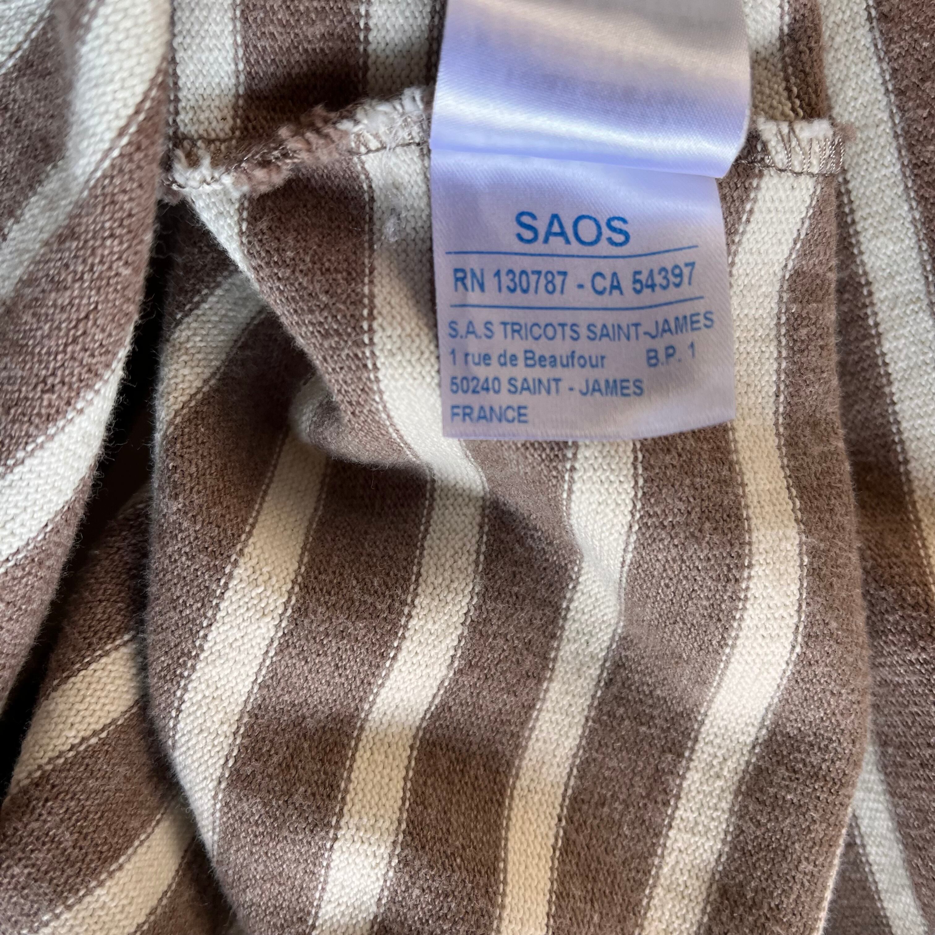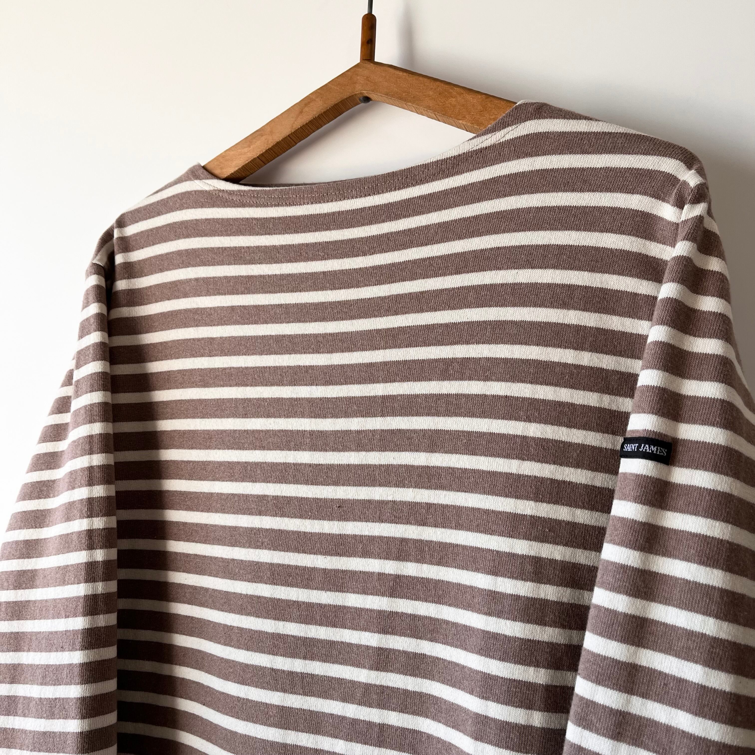 濃いめのベージュと生成りのボーダー柄で、コーディネートしやすい配色です。インナー使いは勿論、もう少し暖かくなったら一枚で着て頂いても雰囲気良いと思います。