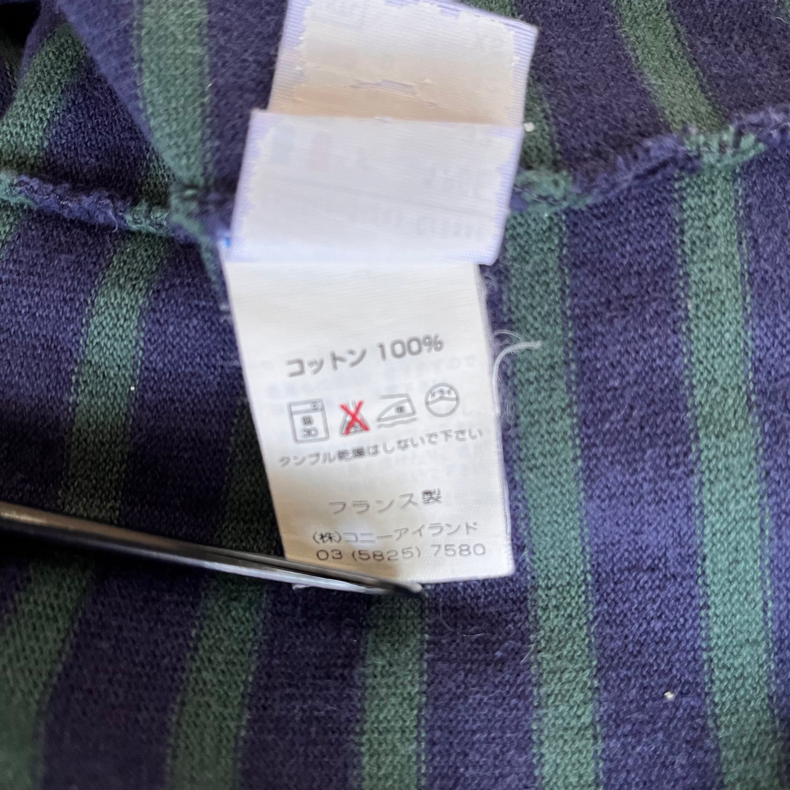 こちらは伝統的なバスクシャツで、ネイビーとグリーンの鮮やかな色使いが好配色で、目を引くアイテムです。