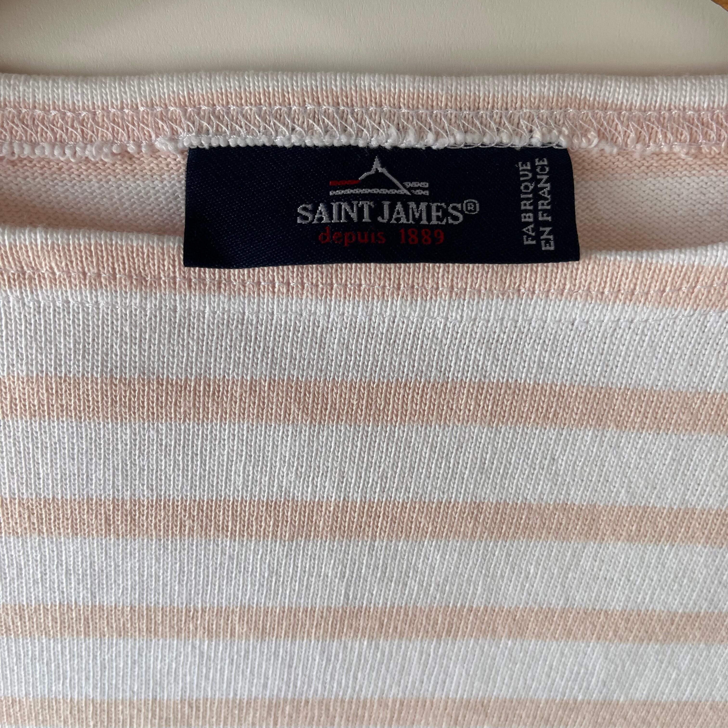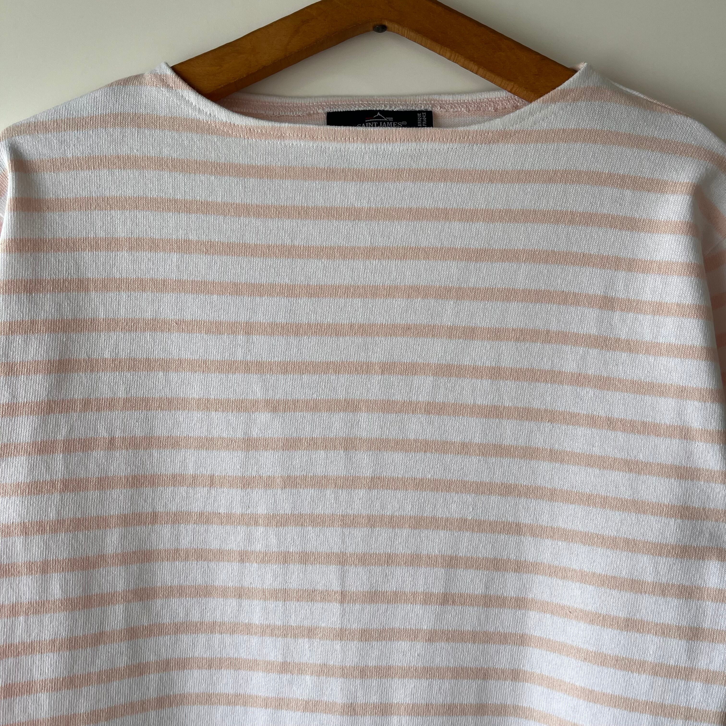 フランス発祥の老舗ブランドSAINT JAMESを代表するアイテムです。ホワイトと薄ピンクのクラシカルなボーダー柄が特徴で、シンプルながらも洗練されたデザインが魅力的です。フランス北部の沿岸地域で誕生したブランドらしいマリンルックを楽しむことができる一着です。