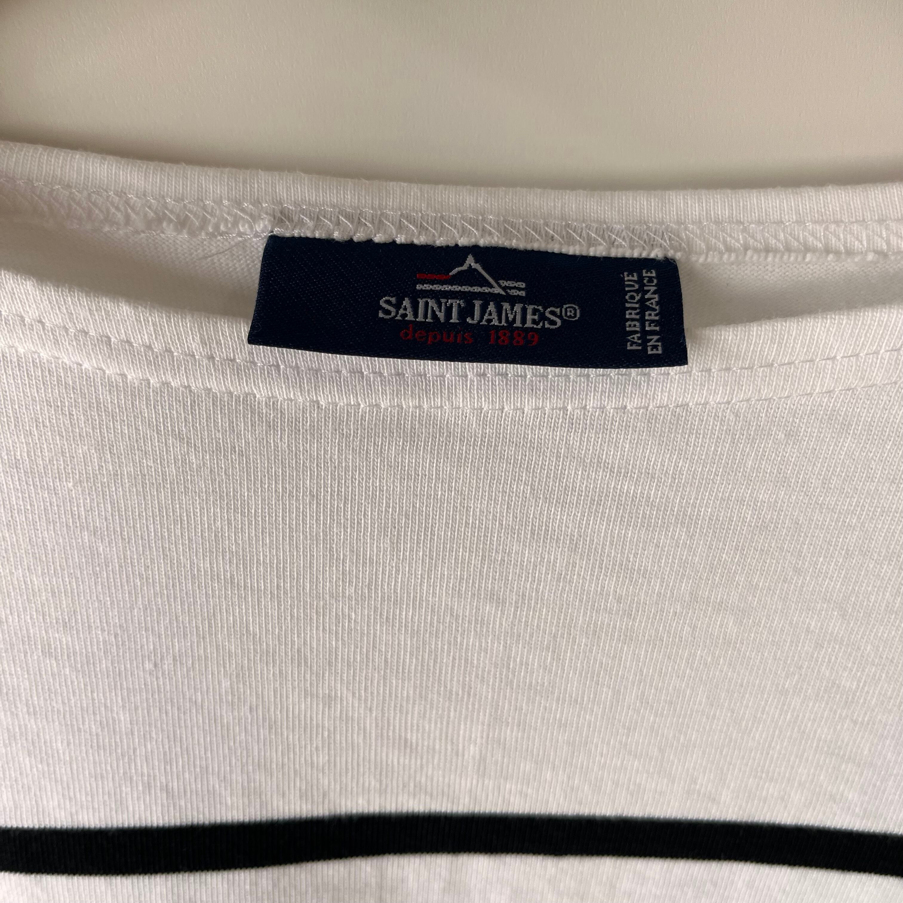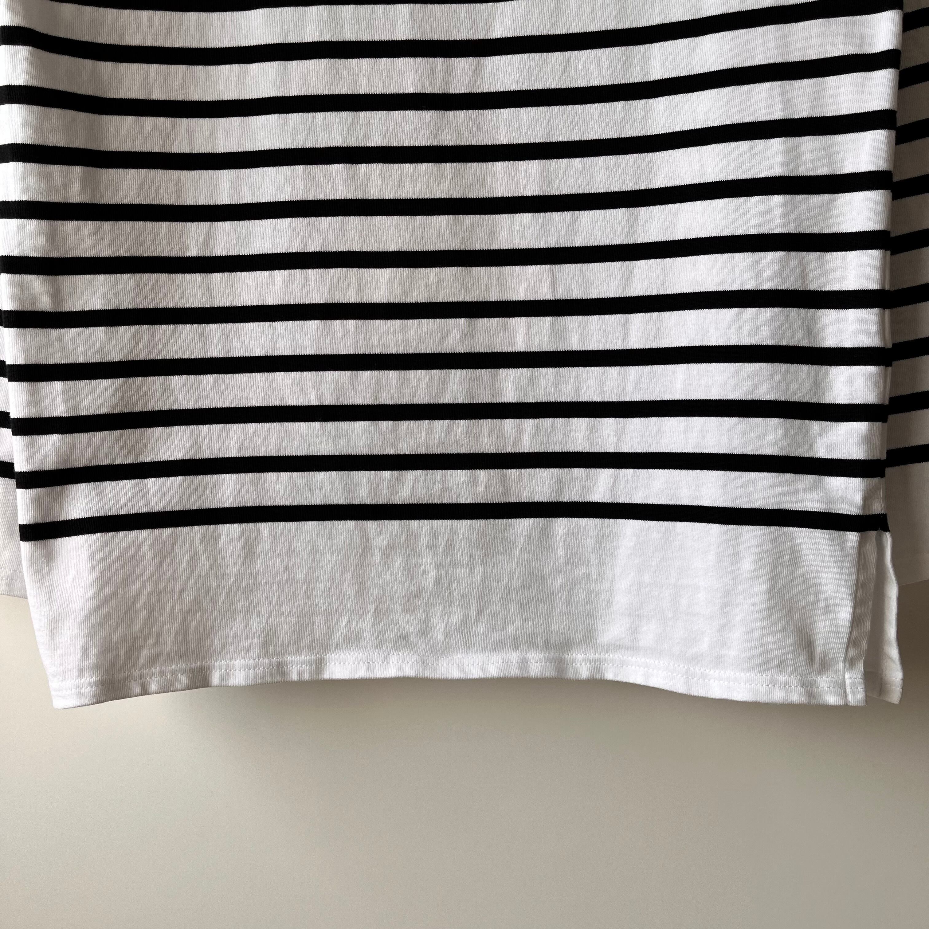 フランス発祥の老舗ブランドSAINT JAMESの代表的な商品です。ホワイトとブラックのクラシカルなボーダー柄が特徴で、シンプルながらも洗練されたデザインが魅力的です。フランス北部の沿岸地域で誕生したブランドらしいマリンルックを楽しむことができる一枚です。