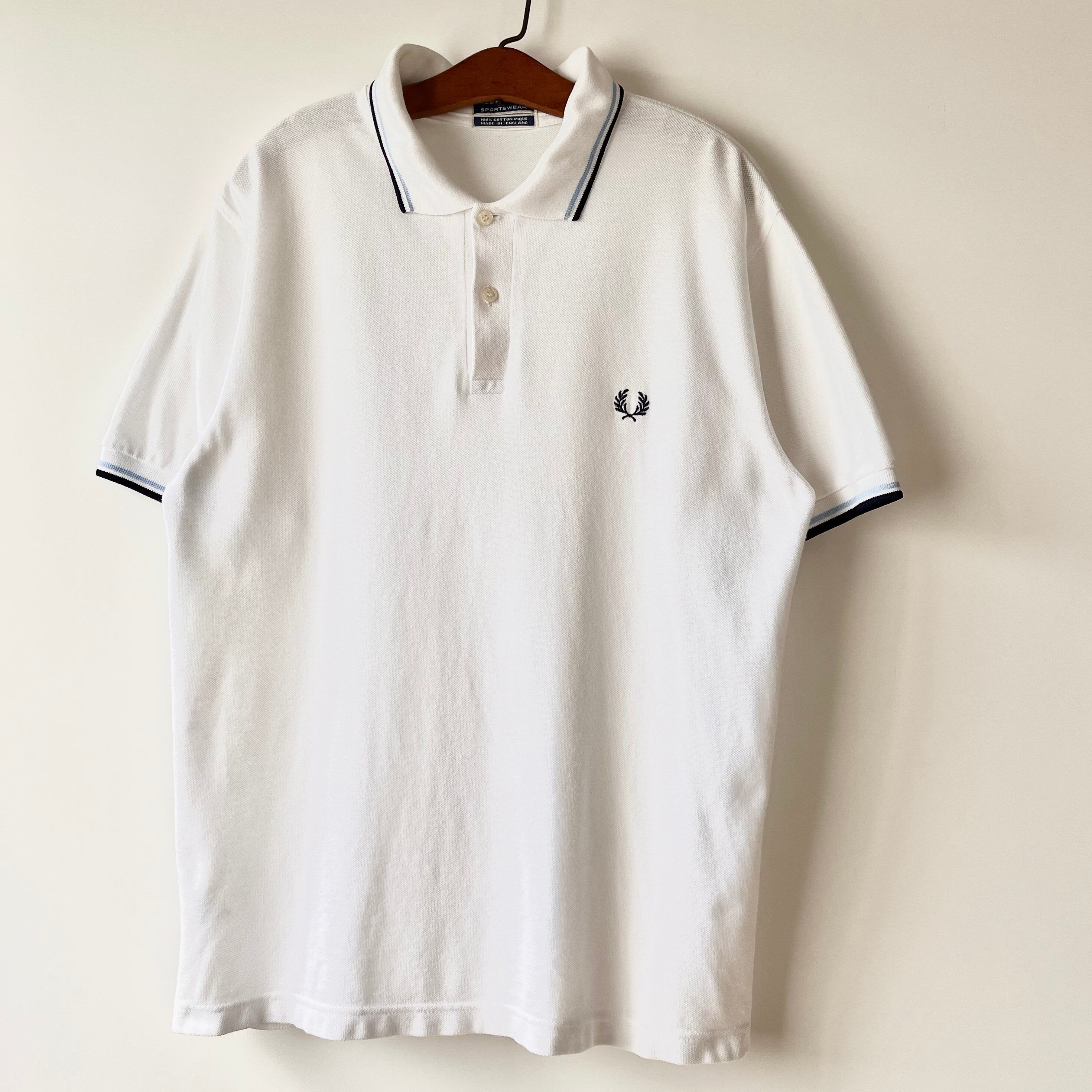 ホワイトカラーのボディに、襟と袖にラインが入るパターンで、シックでありながらもスポーティーな印象です。ボタンにブランド名が入り、胸元にローレルリーフの刺繍が良いアクセントになっています。