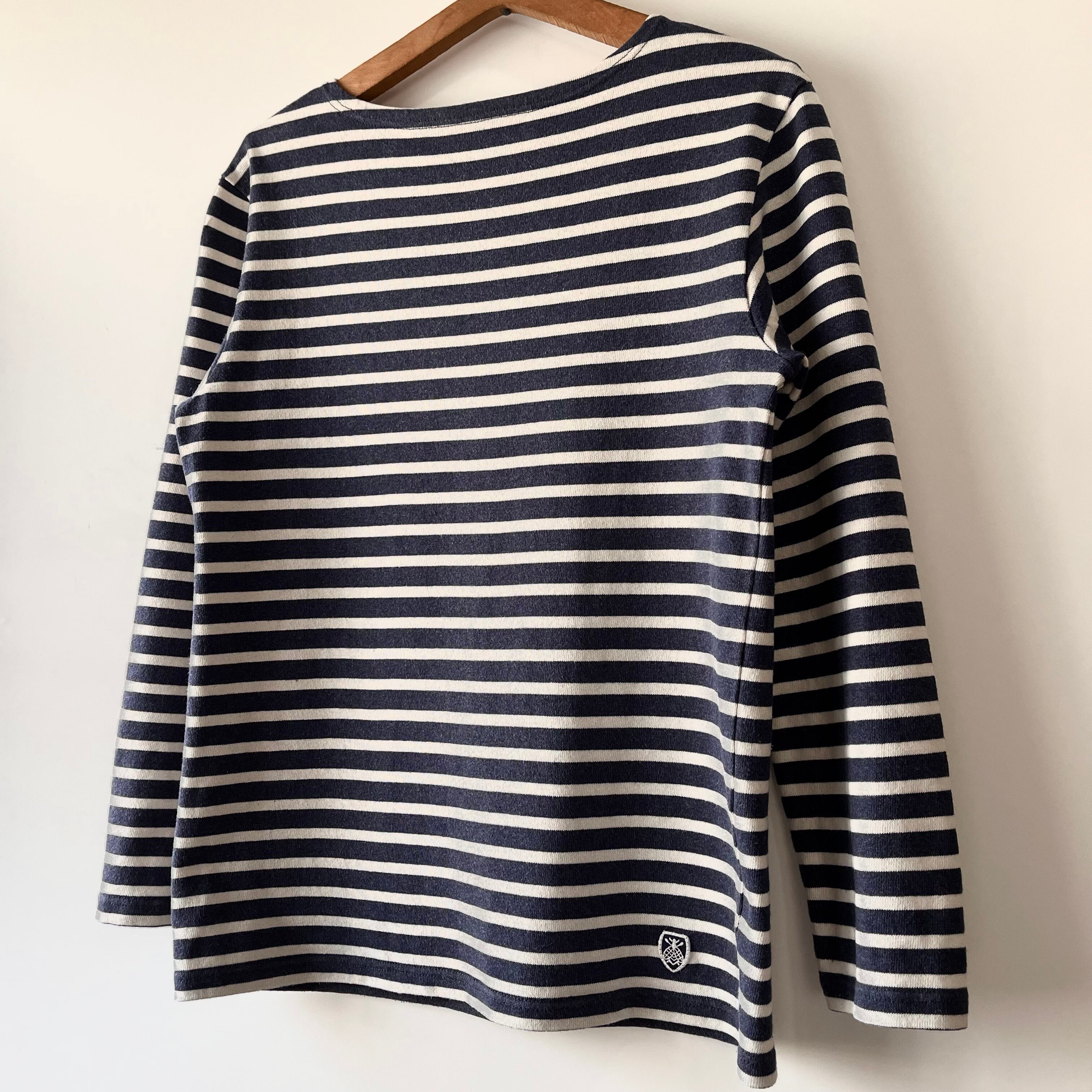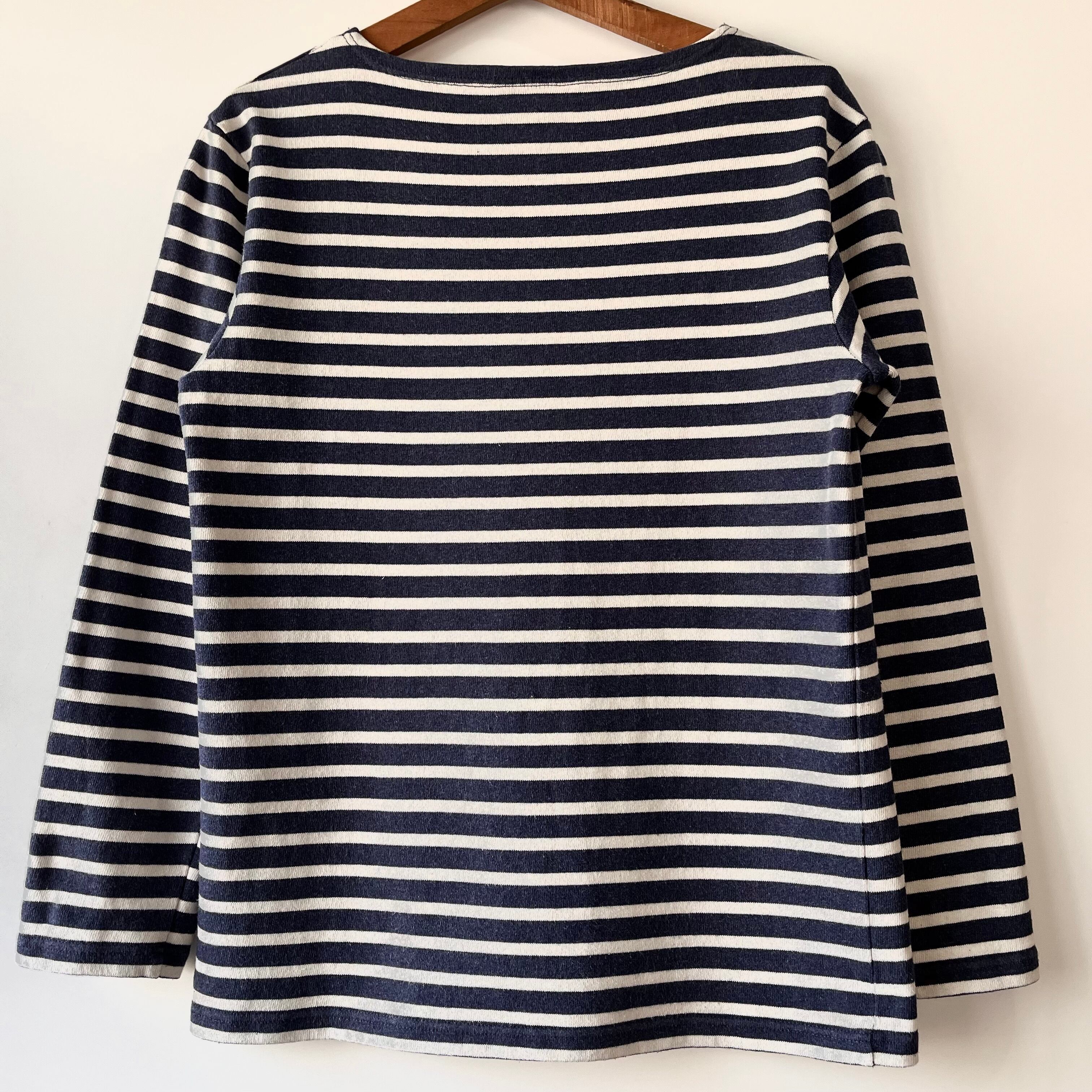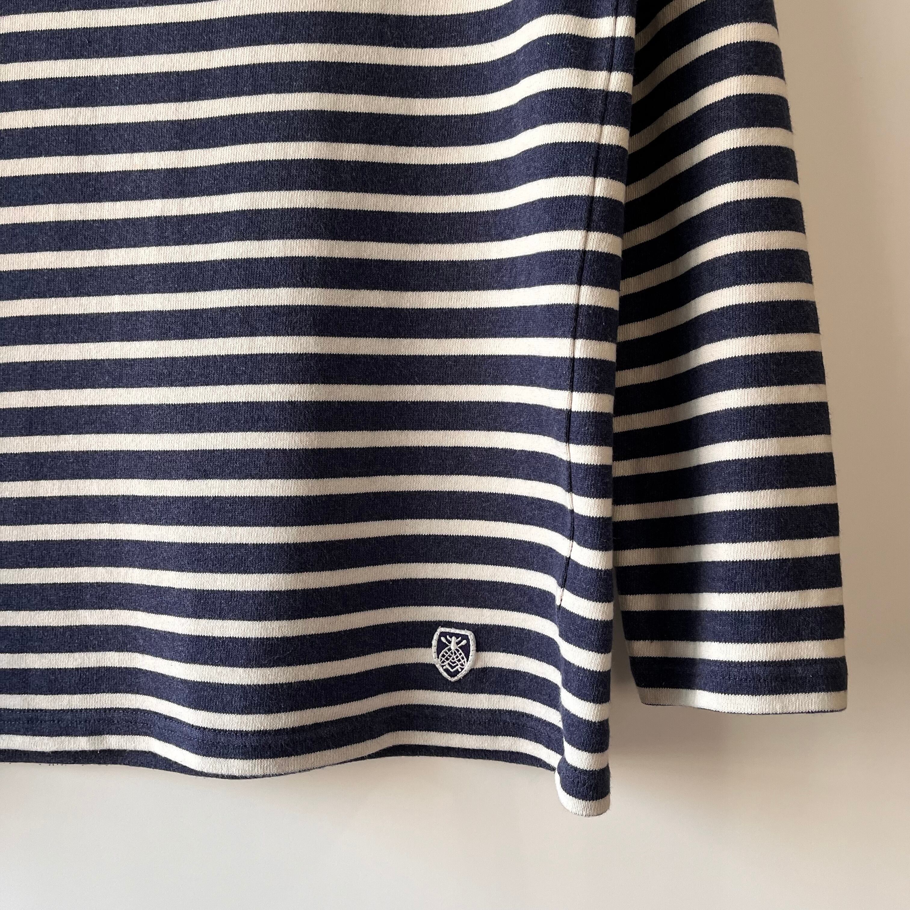 ボートネックが程良い雰囲気を演出し、上品な印象を与えてくれます。ネイビーとホワイトのボーダー柄で清潔感があり、インナー使いに合わせやすく、使い勝手が良いアイテムです。