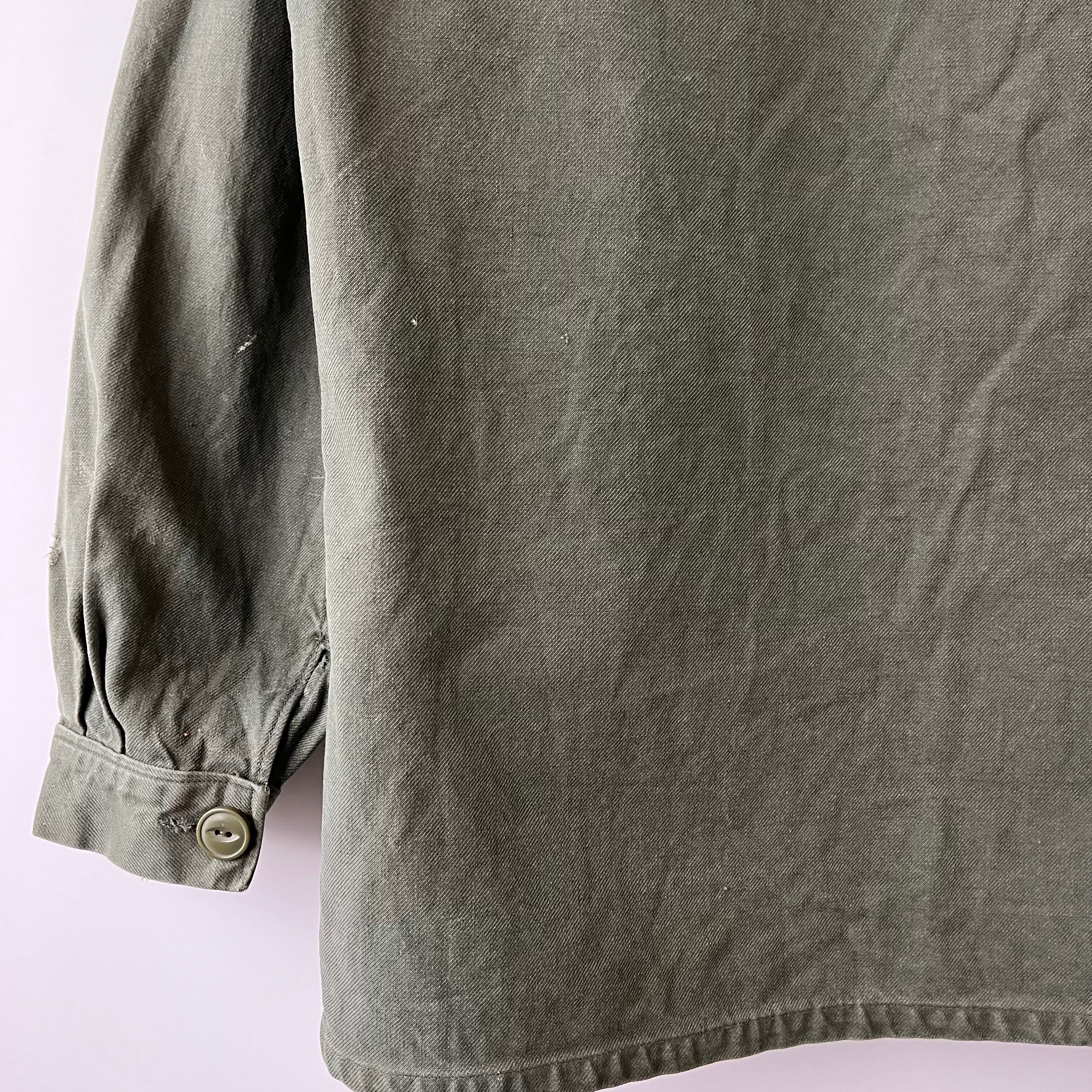 フランス軍のコットンツイルワークジャケットです。インクブルーのものより希少なオリーブカラーのものになります。